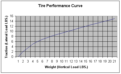 This means 11.25 lbs. will be transfered from the inside tires to the outside tires during cornering. With equal front-to-rear or 50/50 weight distribution, 5.625 lbs. will be transfered from each inside tire to each outside tire. So how much total traction would be avalable to us in the turn? Well our inside tires would have 1.875 lbs. of vertical loading and our outside tires will have 13.125 lbs. If we look at Figure 1 we will see that the inside front and rear tire will have 2.25 lbs. of available traction and the outside front and rear will have approximately 11.5 lbs. of available traction. for a total of 27.5 lbs.