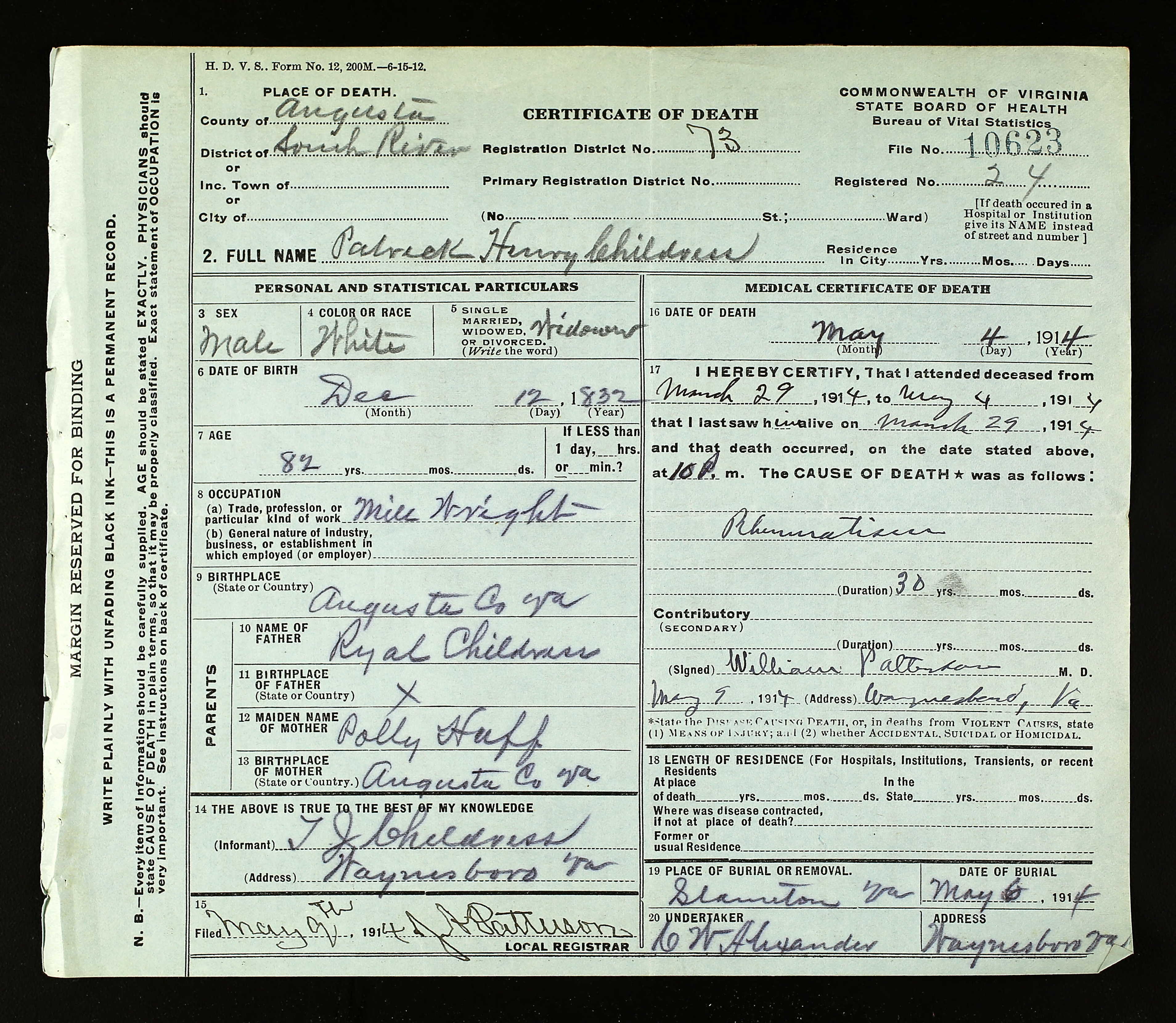 + 10    iii. Patrick Henry Childress 22 was born on 12 Dec 1832 in Waynesboro, Augusta County, Virginia, USA,22 24 25 died on 4 May 1914 in South River, Augusta County, Virginia, USA,22 24 26 at age 81, and was buried on 6 May 1914 in Thornrose Cemetery, Staunton, Staunton City, Virginia, USA.22