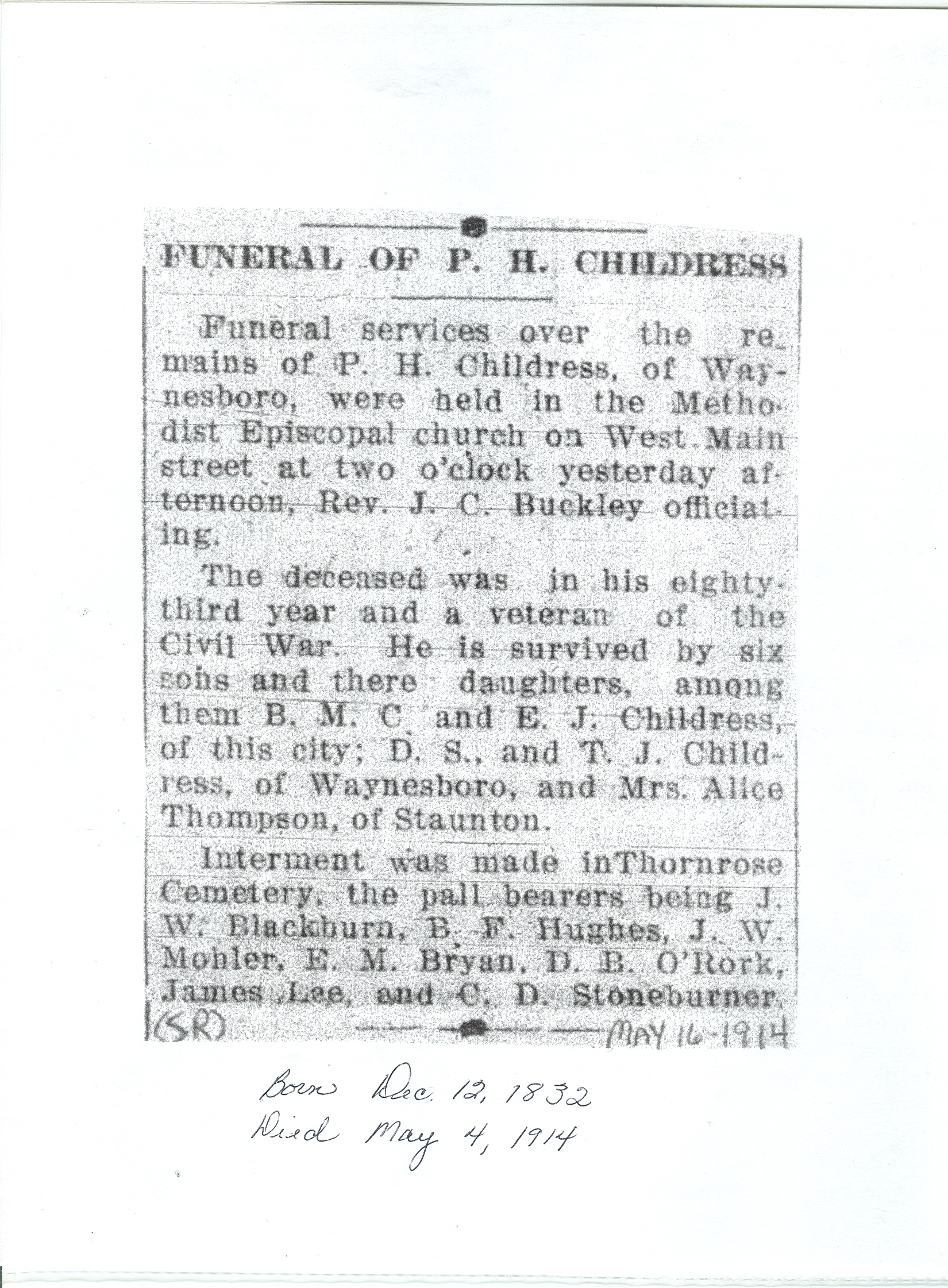 Patrick Henry Childress was born 12 December 1832 near Waynesboro, VA