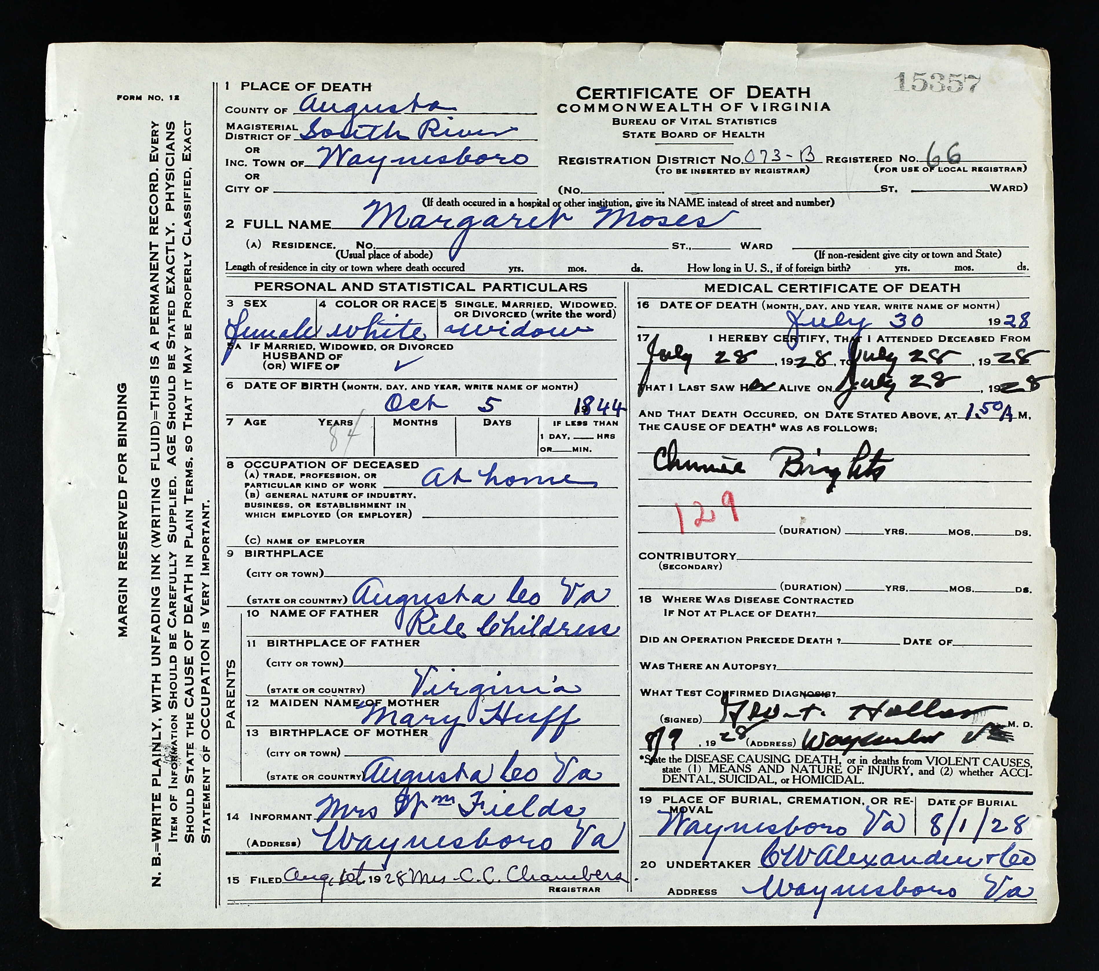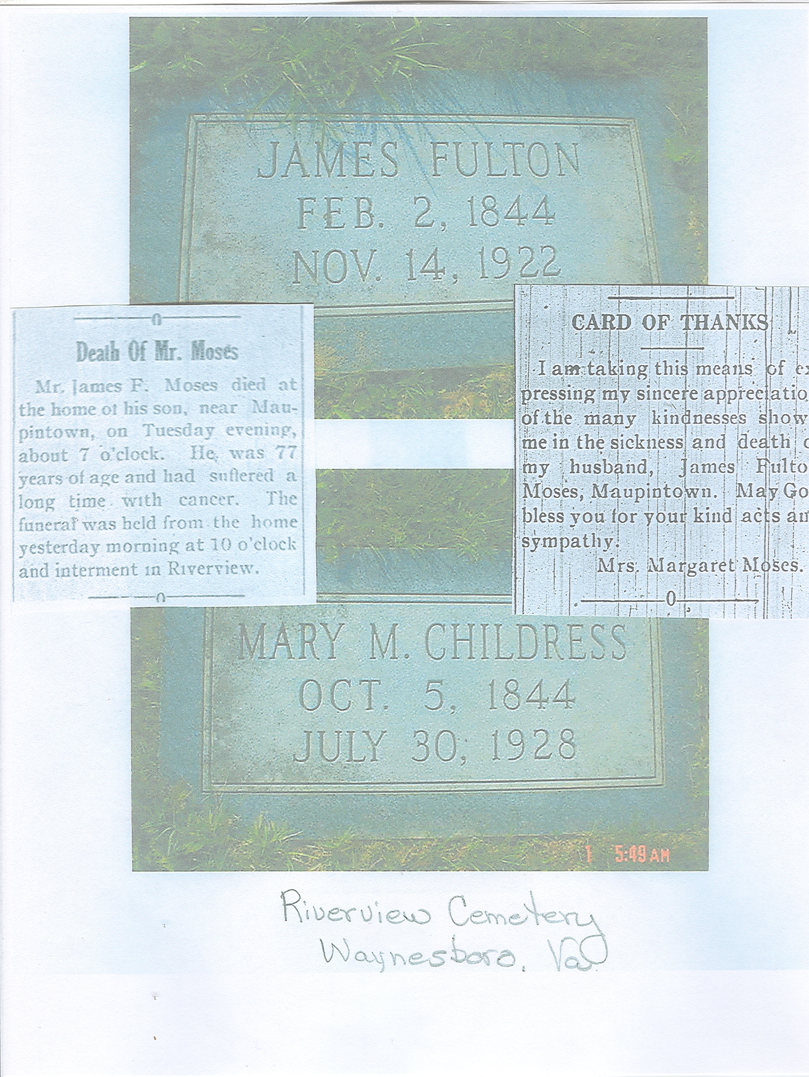 + 12    v. Mary Margaret Childress was born on 5 Oct 1844 in Augusta County, Virginia, USA, died on 30 Jul 1928 in Maupintown, Augusta County, Virginia, USA,31 32 at age 83, and was buried on 1 Aug 1928 in Riverview Cemetery, Waynesboro, Augusta County, Virginia, USA.