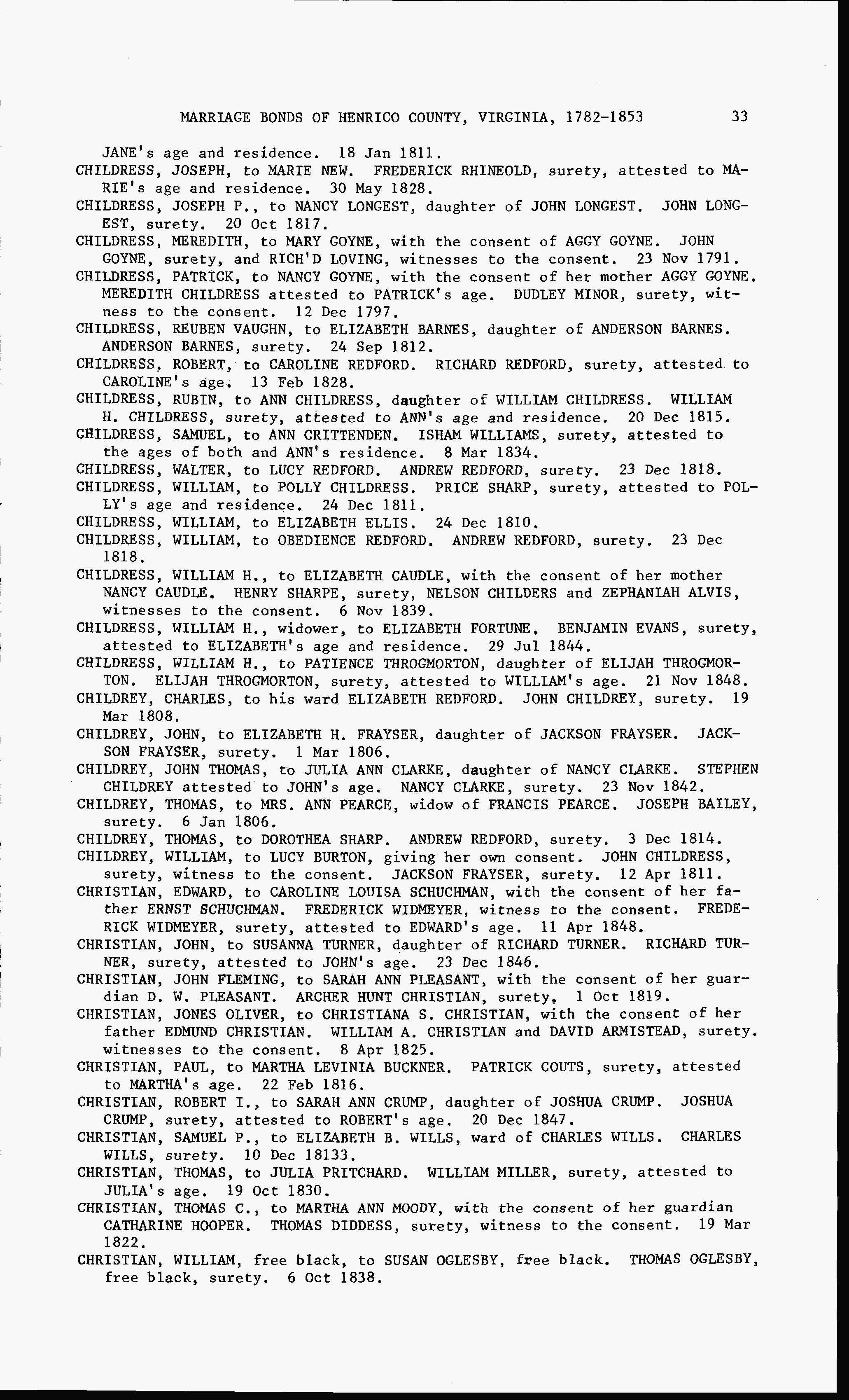 10. (Magazine of Virginia Genealogy), Vol 13, Number 4, p. 97. Patrick Childress: Widow's declaration dated Aug 1860, County of Augusta. Patrick Childress' widow was then aged about 80 years old resident of Waynesboro. Her husband was drafted in Louisa County in August 1813. She was married to said Patrick Childress 12 Dec 1797 in Henrico County and her name before marriage was Nancy Goyne. Her husband died in Augusta County in 1856 and she is still a widow.
