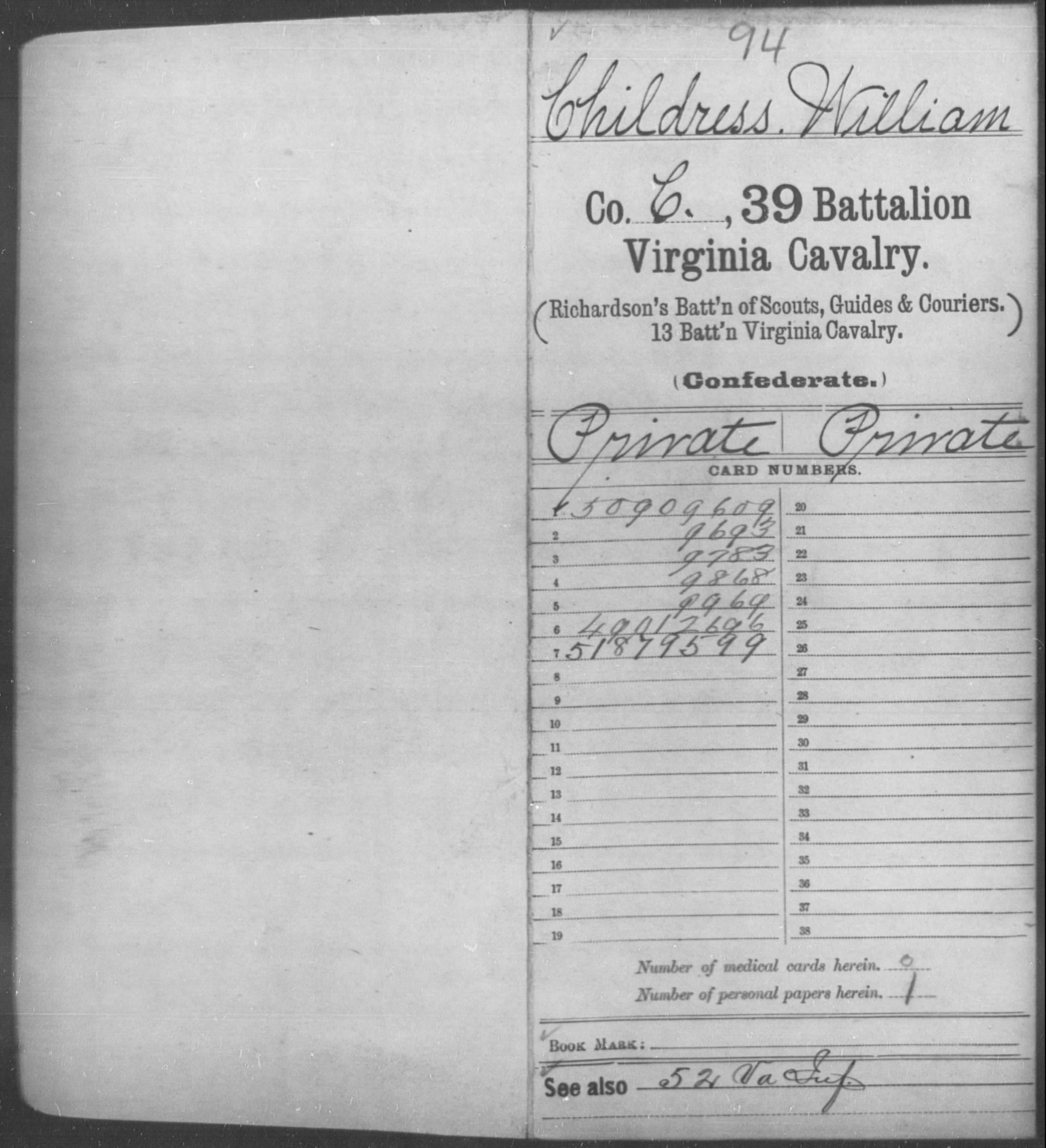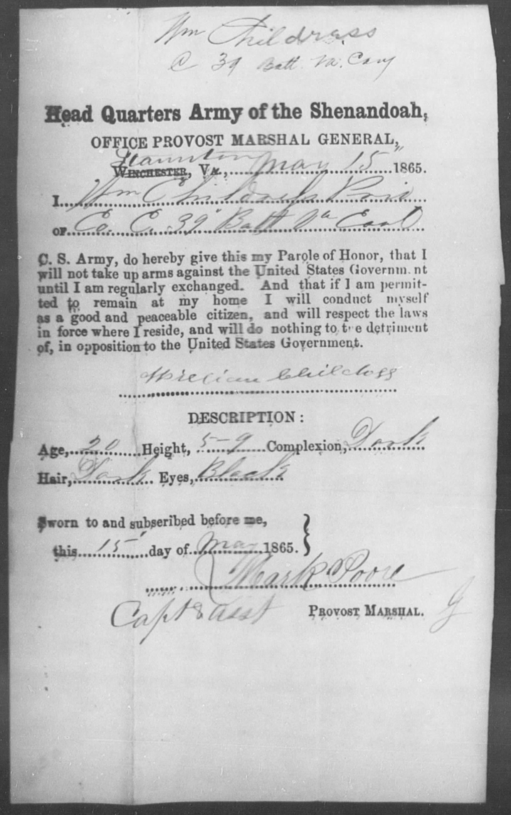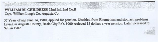 "Childress, Patrick Henry: Pvt Co. C, B, Augusta Co., 12/12/1832, Millwright, Augusta Co, Enl Staunton 7/16/1861 age 20, Present 11/61 - 04/62; reenl 5/1/62; WIA Cedar Run, left thigh 8/9/62, absent wounded until discharged wounds and permanent disease of the spine and spermatonhuas, "Richmond 10/17/1862, age 27, 5'10, fair complexion, eyes gray, hair brown, Millwright, age 37, Fisherville PO, Augusta Co, 1870 census. Died South River District 5/4/1914 Augusta Co., Buried Thornrose Cemetery, Staunton." [Film M382 Roll 10]