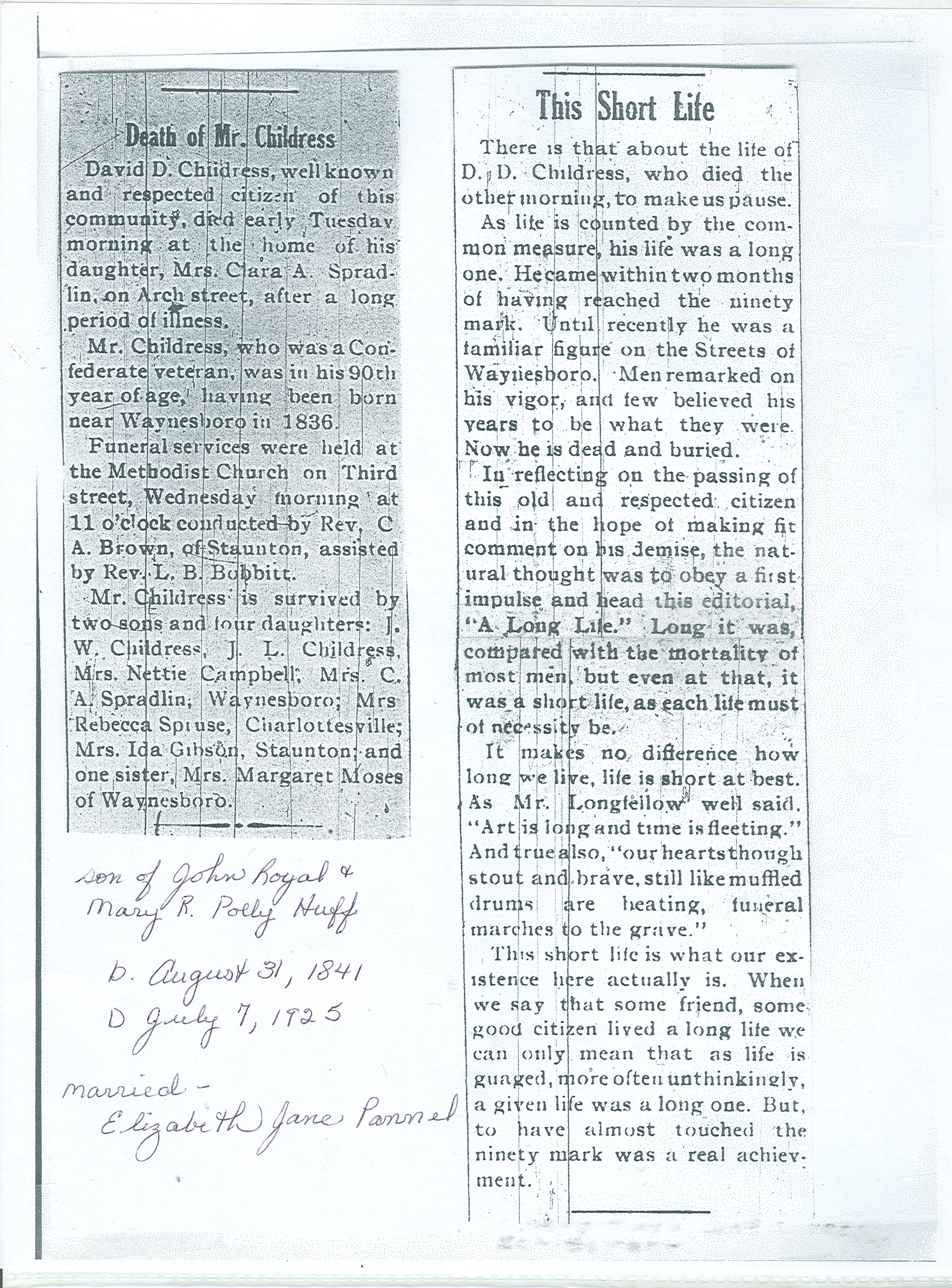 85. Obituary from Waynesboro, VA Newspaper, John Wesley Childress.