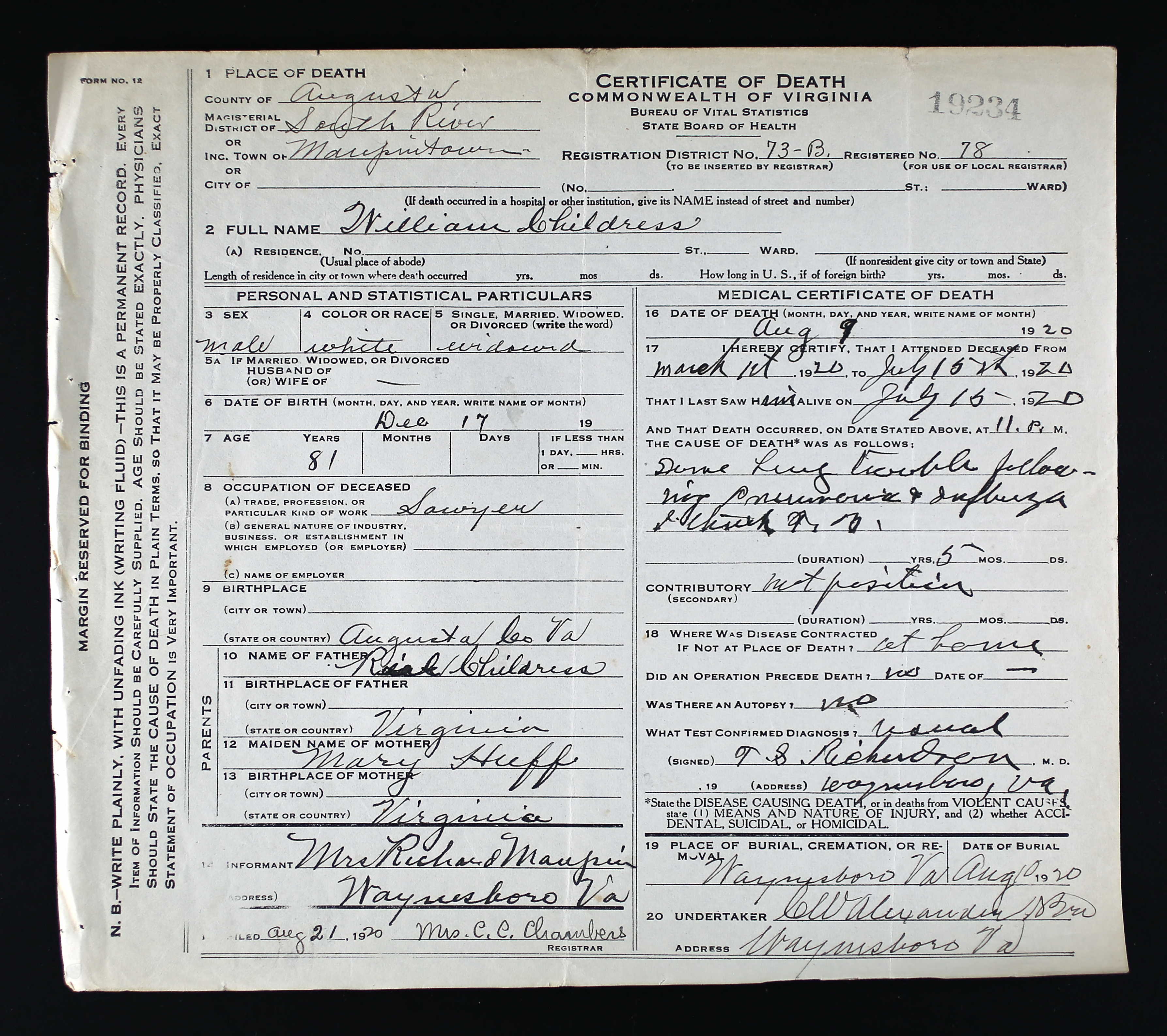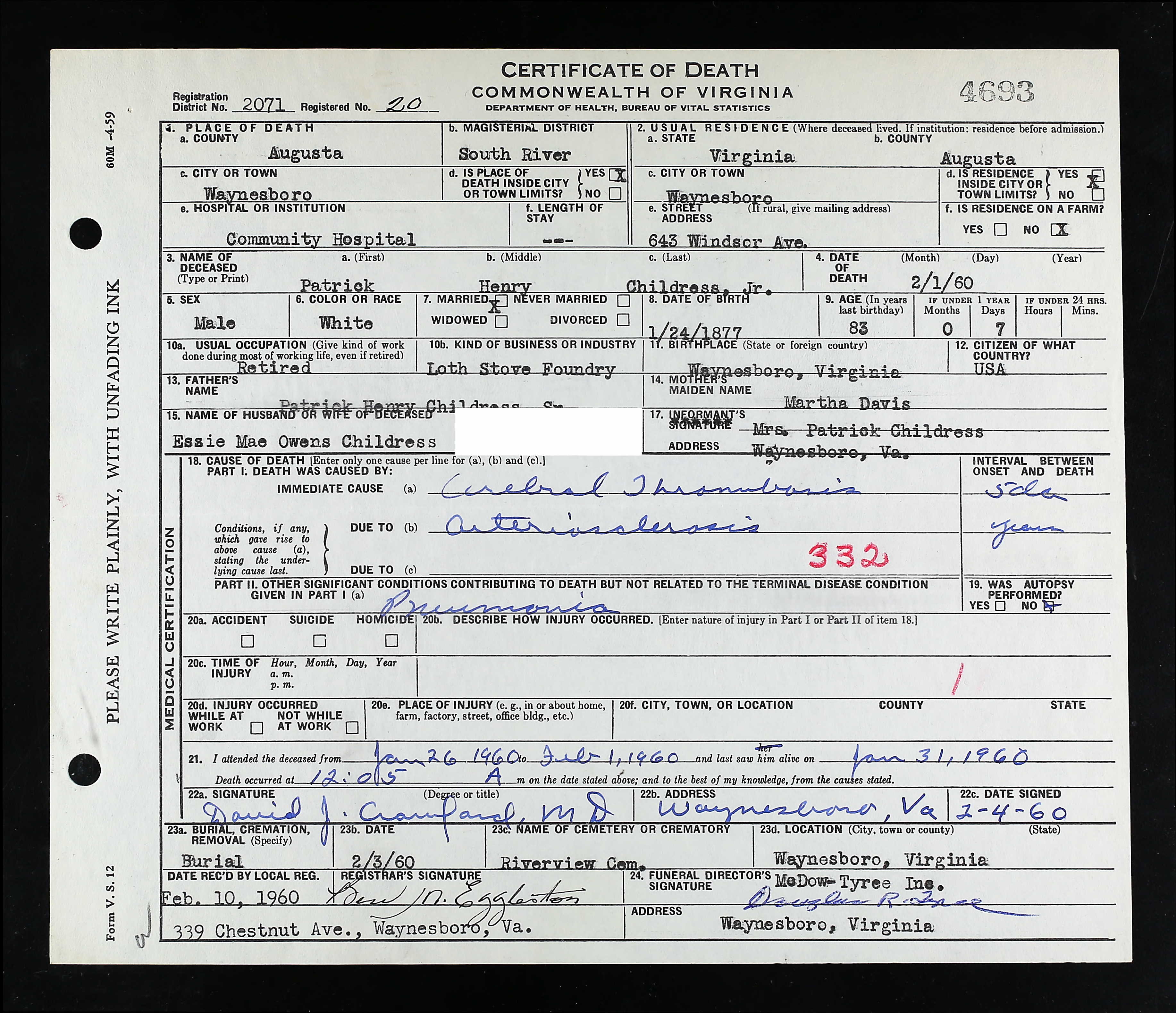 10. Patrick Henry Childress 22 was born on 12 Dec 1832 in Waynesboro, Augusta County, Virginia, USA,22 24 25 died on 4 May 1914 in South River, Augusta County, Virginia, USA,22 24 26 at age 81, and was buried on 6 May 1914 in Thornrose Cemetery, Staunton, Staunton City, Virginia, USA.22