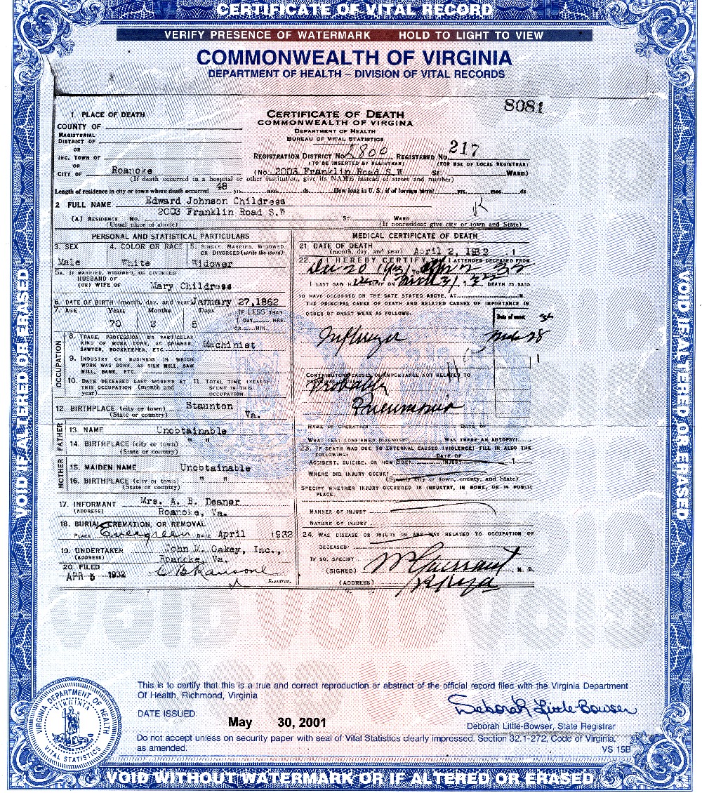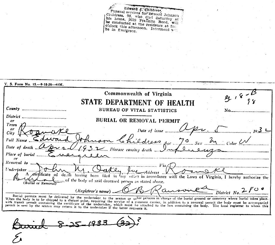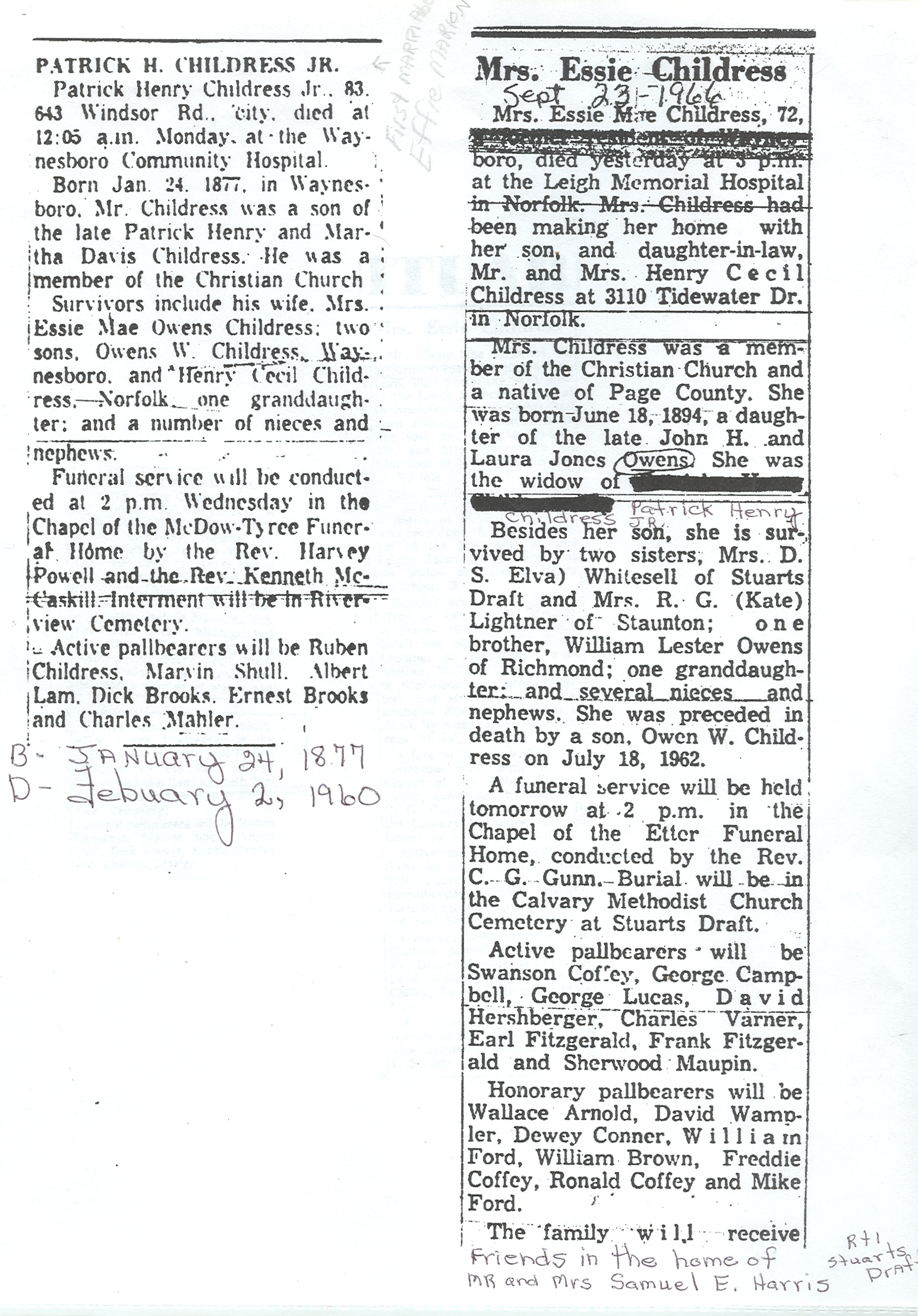 67. Obituary from Waynesboro, VA Newspaper, Vincent Summerfield Childress. Vincent Summerfield Childress died at his home near Afton, at 4:17 a.m. today, at the age of 71, after an extended illness. He was born in Augusta County Dec. 12, 1877, and lived in Waynesboro until 1935 when he moved to near Afton where he was proprietor of a service station on the Lynchburg road. He is survived by his widow, Yhorlia Barker Childress; three daughters, Mrs. Virginia C. Stone, Waynesboro; and Mrs. Floyd W. Gray and Mrs. Marguerite C. Brown, both of Afton; one son, Carl S. Childress of Afton; and two brothers, Patrick H. Childress, of Waynesboro and A. D. Childress, of Hagerstown, Md. Also six grandchildren, Mrs. Thomas A. Halter, Miss Alice Gray, Miss Jo Anne Gray, Donnie Gray, and Carl Allen Brown, all of Afton, and Woodrow W. Stone, of Waynesboro; and one great-grandchild, Charles Stone, of Waynesboro. Pallbearers will be Henry Pannell, Earl Barker, Solon Barker, Austin Pannell, Preston Barker and Walker Barker. Funeral will be held at 2 p.m. Monday in the chapel of the Etter Funeral Home, under the direction of Rev. B. F. Robinson. Interment will be in Riverview Cemetery.
