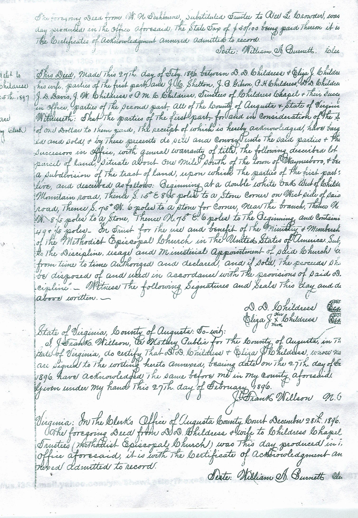 21. Legal: J.C. Shelton, P.H. Childress, D.D. Childress, J.D. Davis, J.W. Childress, P.M.O. Childress were appointed trustees for Childress Methodist Church, 19 May 1898, Waynesboro, Augusta County, Virginia, USA. 54