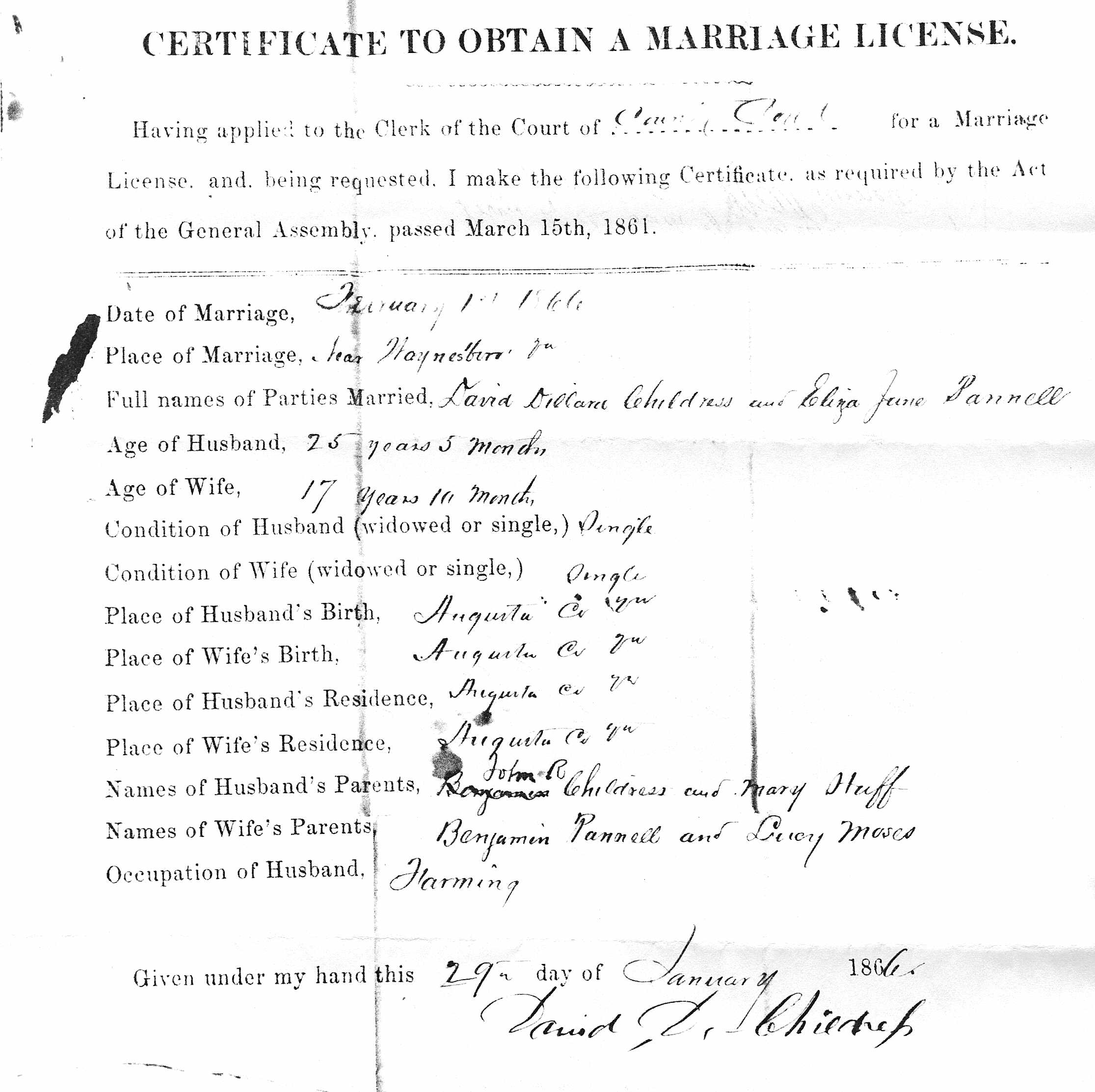 82. Augusta County Clerk of Court, Eliza 17 years, 10 mos. In the "Certificate to Obtain a Marriage License" for David and Eliza, their ages are give as David 25 years, 5 mos. and Eliza 17 years, 10 mos. This was recorded 29th day of January 1866 and signed by Benjamin Pannel and witnessed by Vincent Childress.