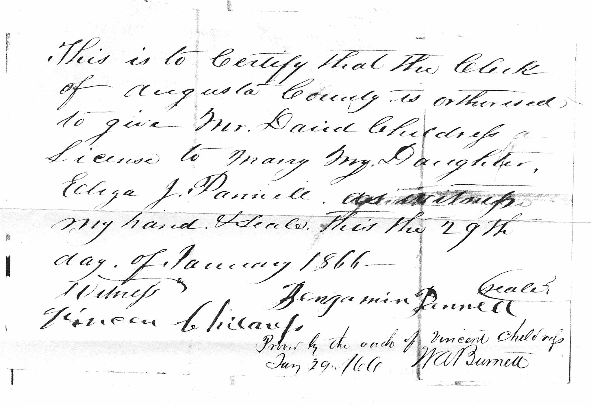 81. Augusta County Clerk of Court, "Certificate to Obtain a Marriage License" for David and Eliza. In the "Certificate to Obtain a Marriage License" for David and Eliza, their ages are give as David 25 years, 5 mos. and Eliza 17 years, 10 mos. This was recorded 29th day of January 1866 and signed by Benjamin Pannel and witnessed by Vincent Childress.