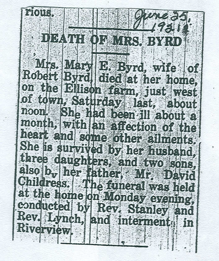 Mrs. Mary E. Byrd, wife of Robert Byrd, died at her home, on the Ellison Farm, Saturday last, about noon. She had been ill about a month with an affection of the heart and some other ailments. She is survived by her husband, three daughters, and two sons, also by her father, Mr. David Childress. The funeral was held at the home on Monday evening, conducted by Rev. Stanley and Rev. Lynch, and interment in Riverview.