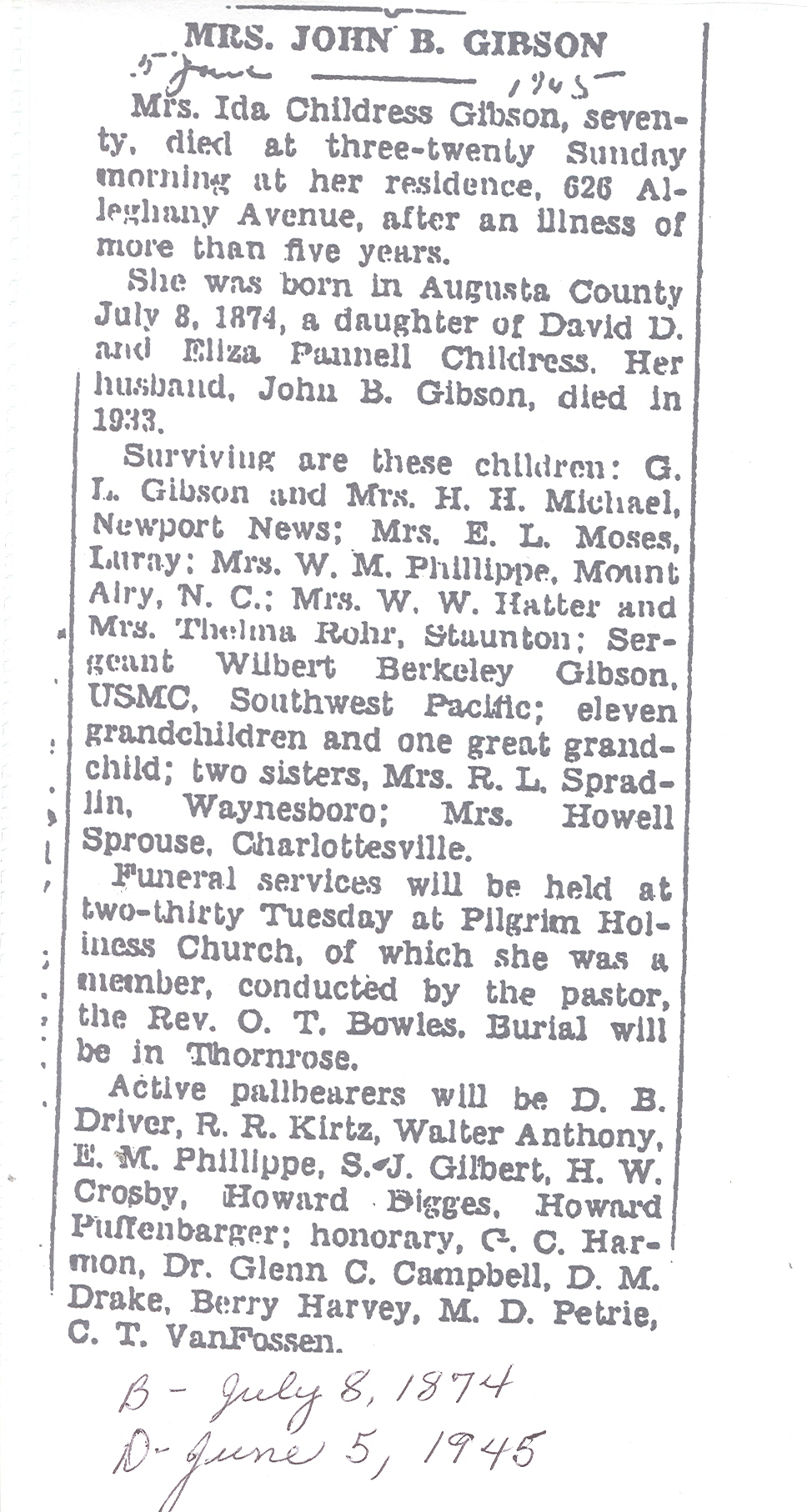 90. Obituary from Waynesboro, VA Newspaper, Ida Bell Childress Gibson.