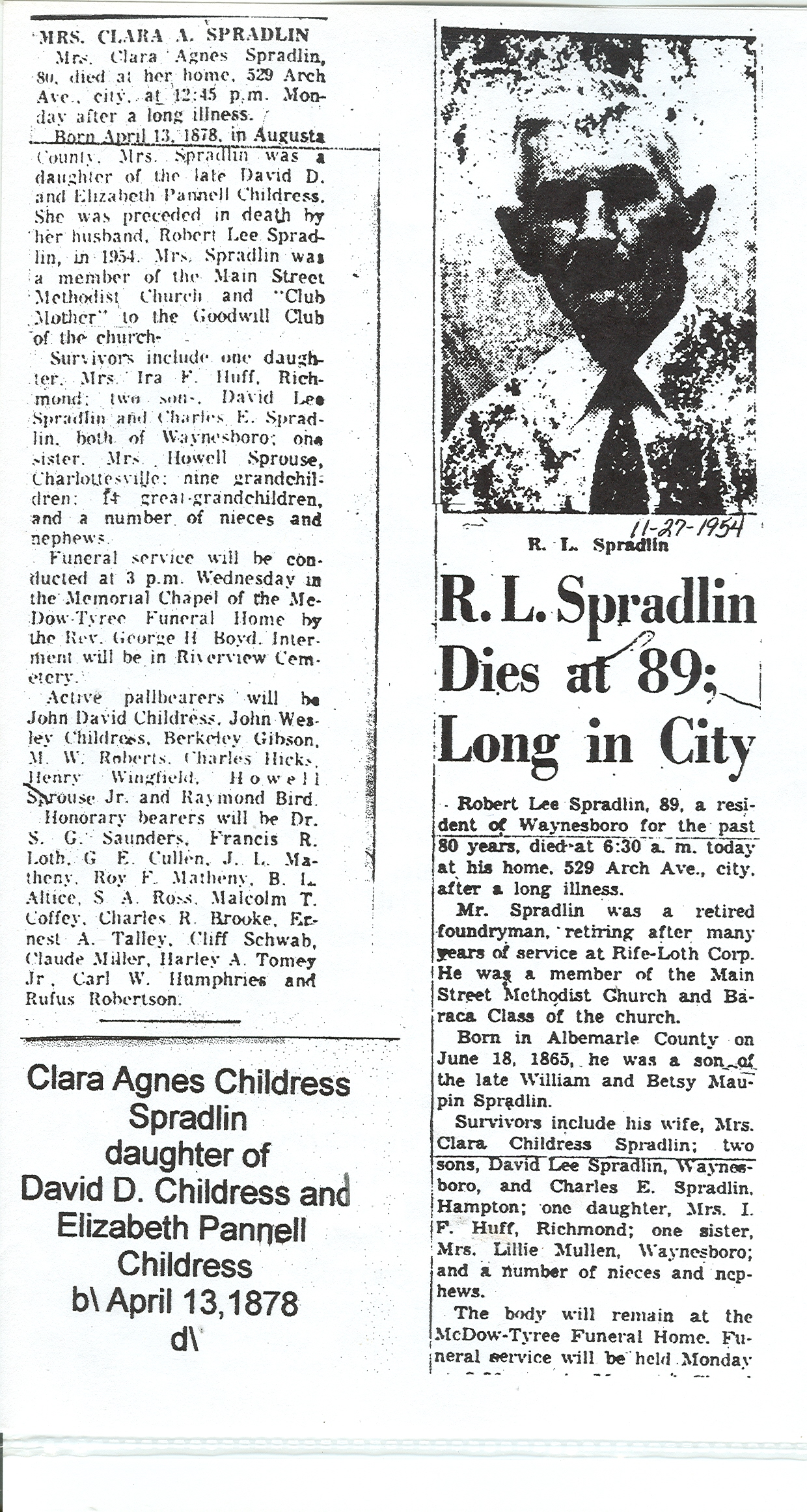 91. Obituary from Waynesboro, VA Newspaper, Clara Agnes Childress Spradlin.