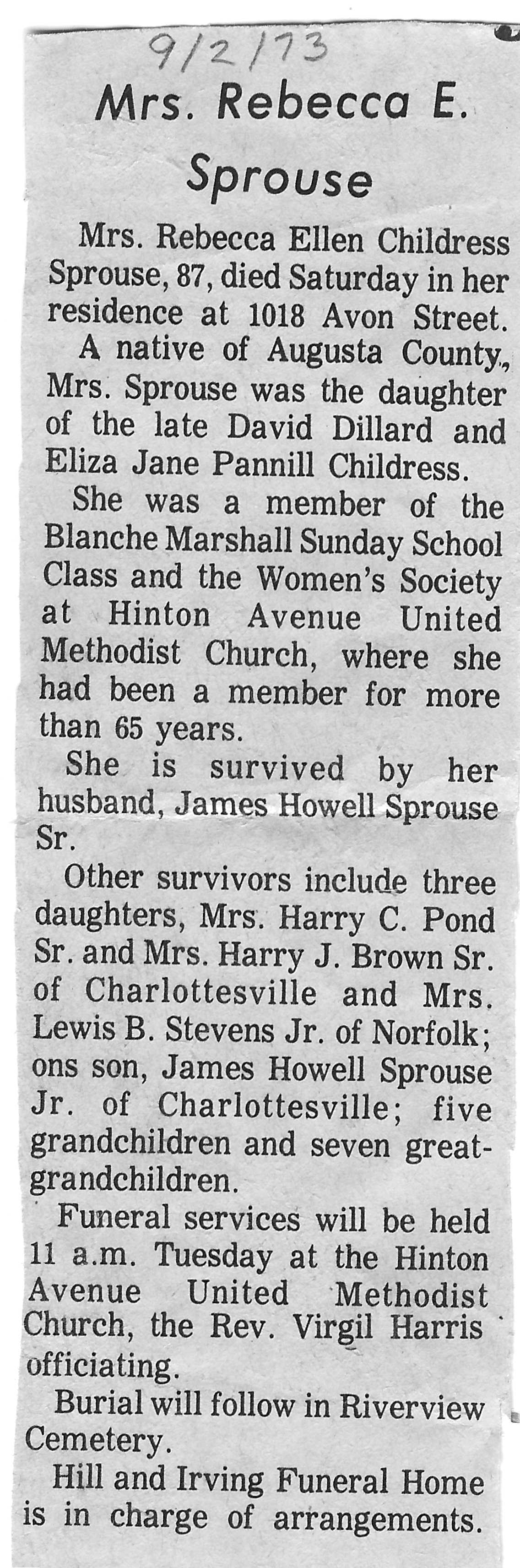 96. Charlottesville Daily Progress, Obituaries, Rebecca Ellen Childress Sprouse.