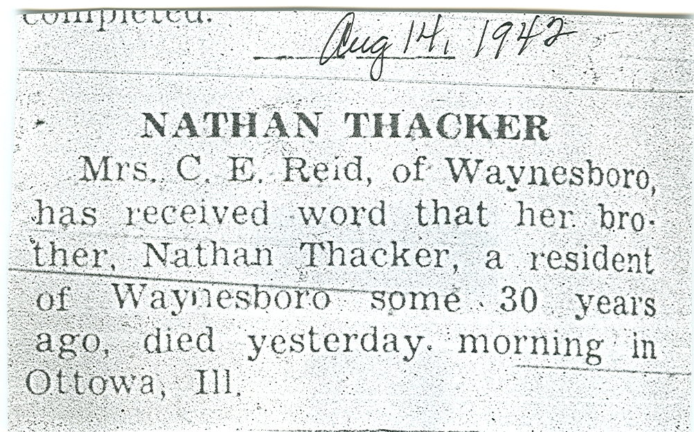 Mary next married Nathan Thacker, son of Daniel Thacker and Susan D. Dudley, about 1902 in Augusta County, Virginia, USA.129 Nathan was born on 8 Jul 1870 in Albemarle County, Virginia, USA and died on 13 Aug 1942 in Ottowa, Illinois, USA,130 at age 72.