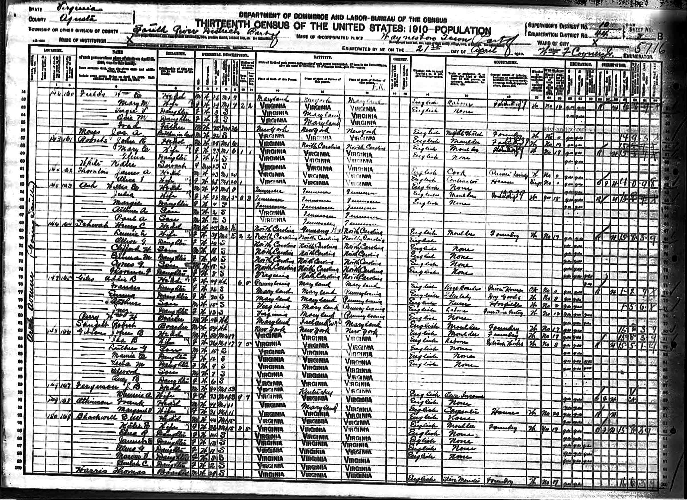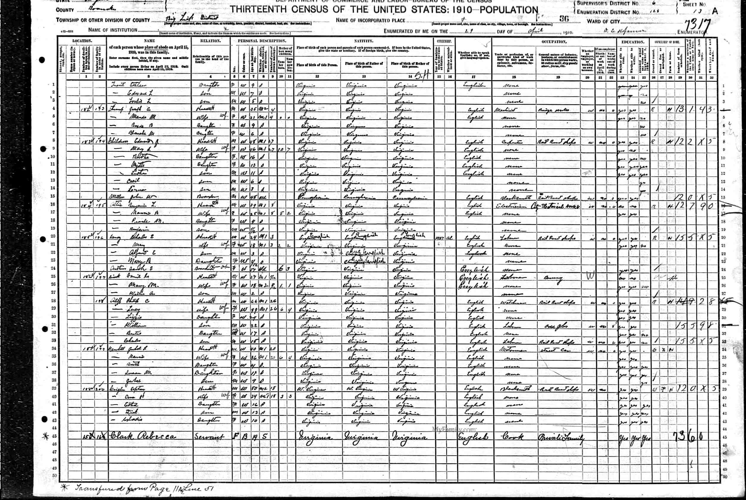 8. Occupation: 1900 Census Carpenter Rail Road Shop, 29 Apr 1910, Big Lick, Roanoke County, Virginia, USA. 155