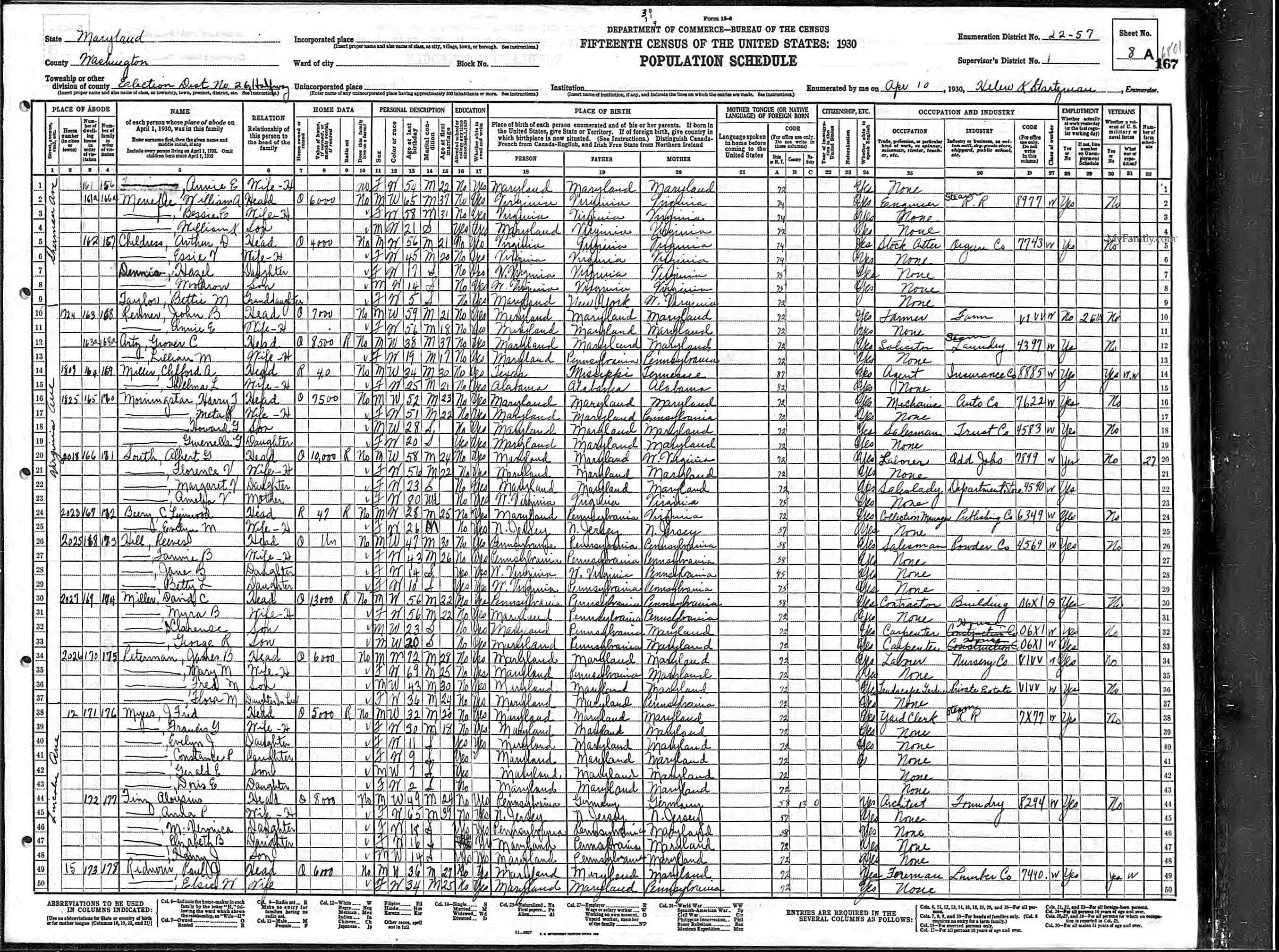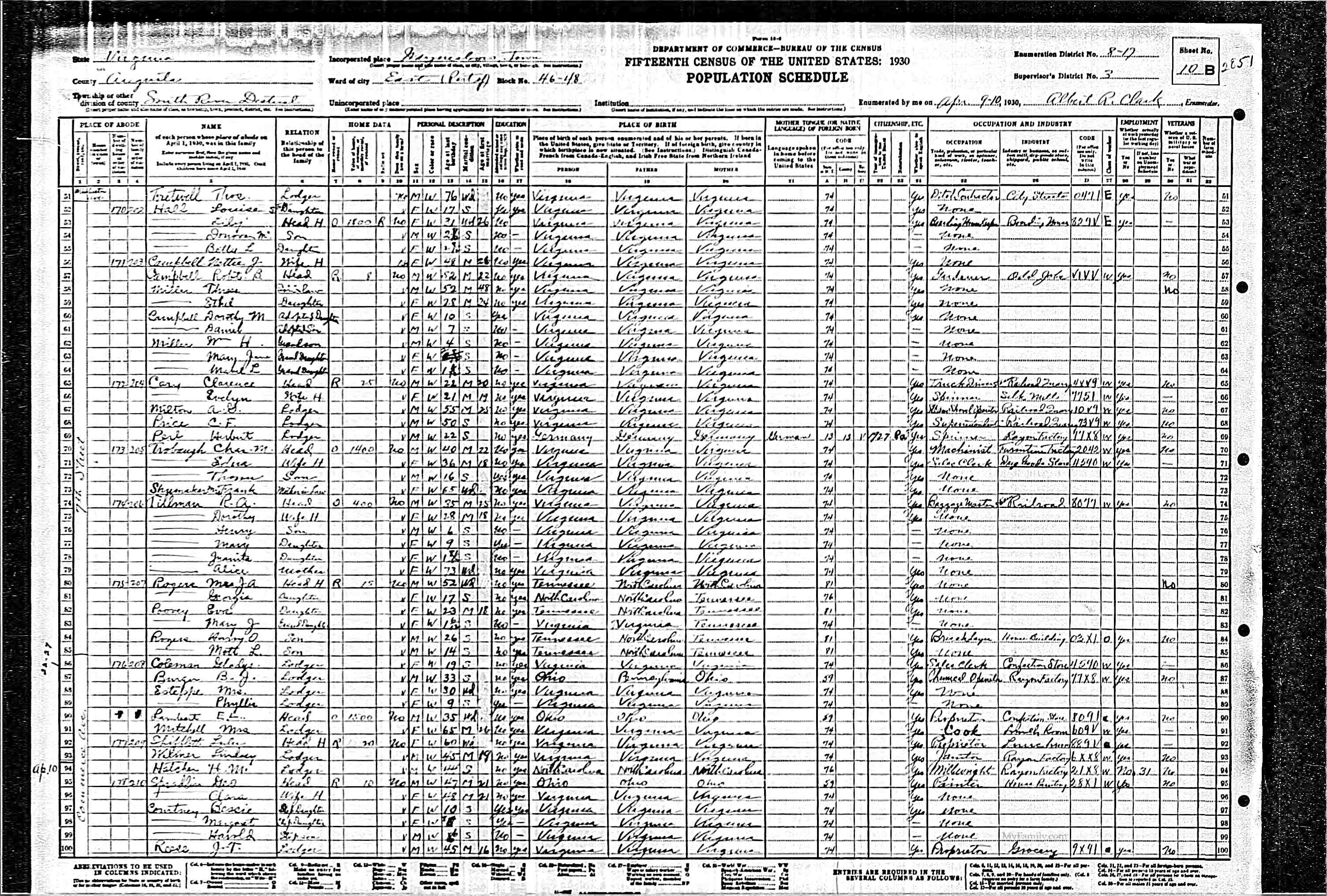 12. Occupation: 1930 Census Machinist at Stove Company, 2 Apr 1930, Roanoke, Roanoke (city), Virginia, USA. 157