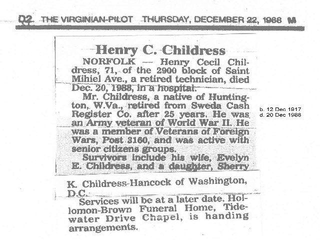 308. Obituary from Waynesboro, VA Newspaper, Della V. Childress.