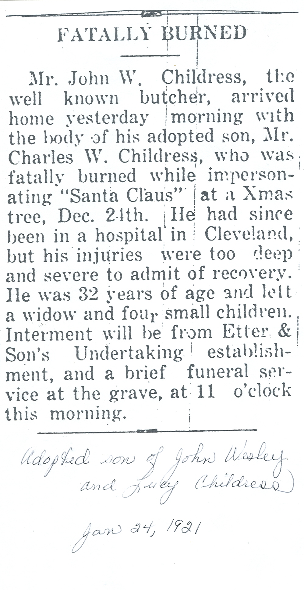 30. Edward Johnson Childress 22 was born on 2 Dec 1862 in Clay Forge, Fisherville, Augusta County, Virginia, USA,22 died on 2 Apr 1932 in Roanoke, Roanoke (city), Virginia, USA,61 at age 69, and was buried on 5 Apr 1932 in Evergreen Cemetery, Roanoke, Roanoke (city), Virginia, USA.62 The cause of his death was Pneumonia caused by influenza.