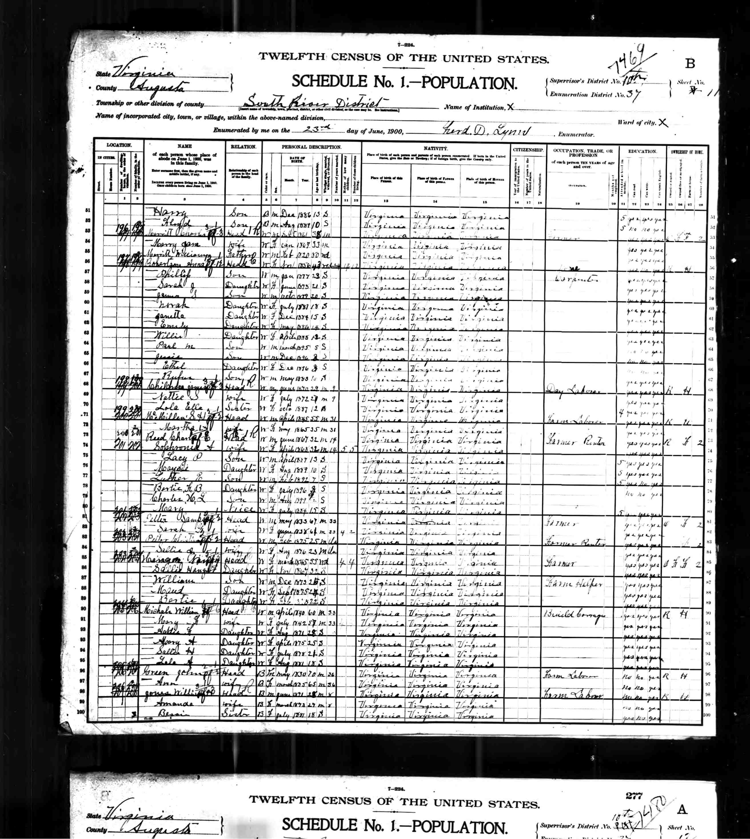 216. 1900 Virginia Census, Augusta, South River, ED 39, Sht 12A.