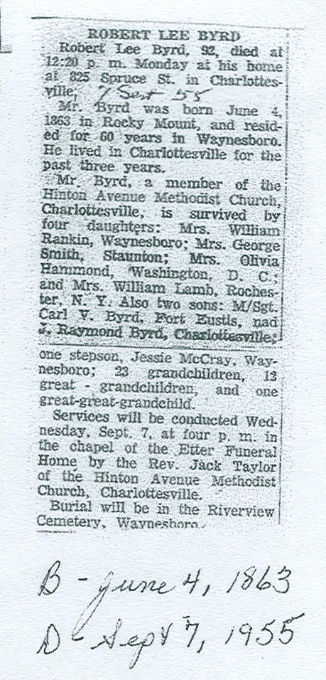 221. Obituary from Waynesboro, VA Newspaper, Robert Lee Spradlin.