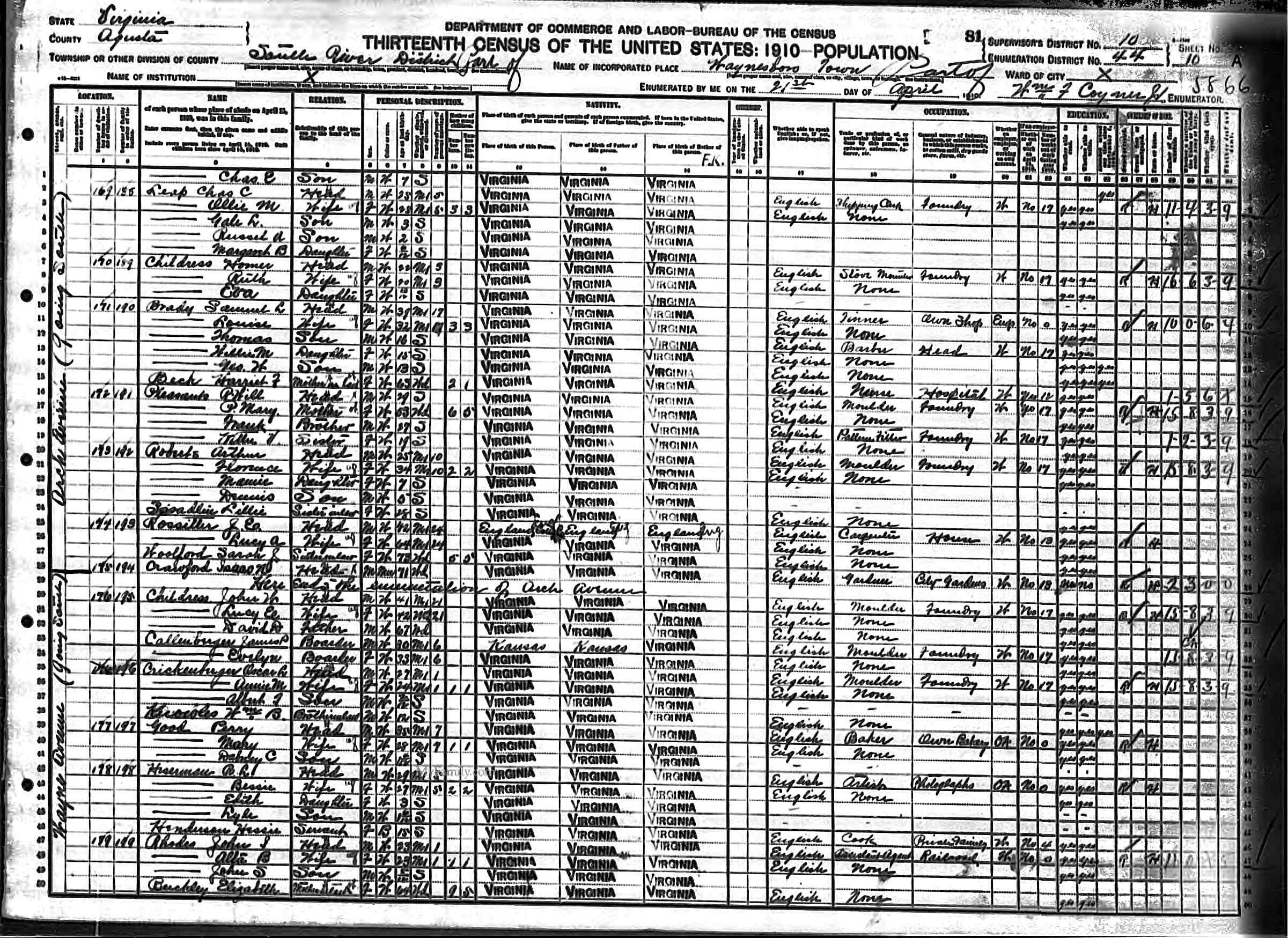 7. Census: Edward Johnson Childress and family, 29 Apr 1910, Big Lick, Roanoke County, Virginia, USA. 155