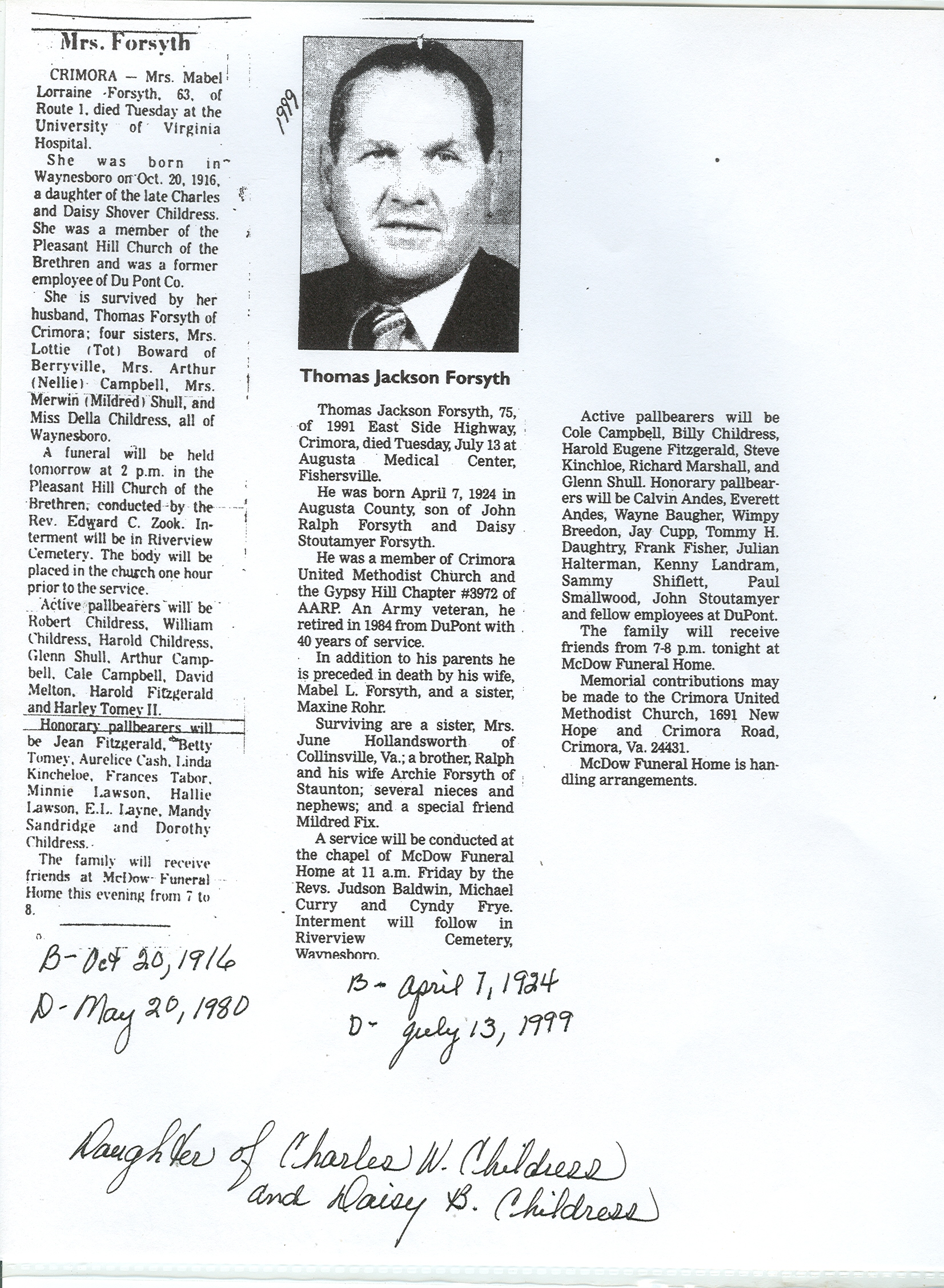 452. Obituary from Waynesboro, VA Newspaper, Thomas Jackson Forsyth.