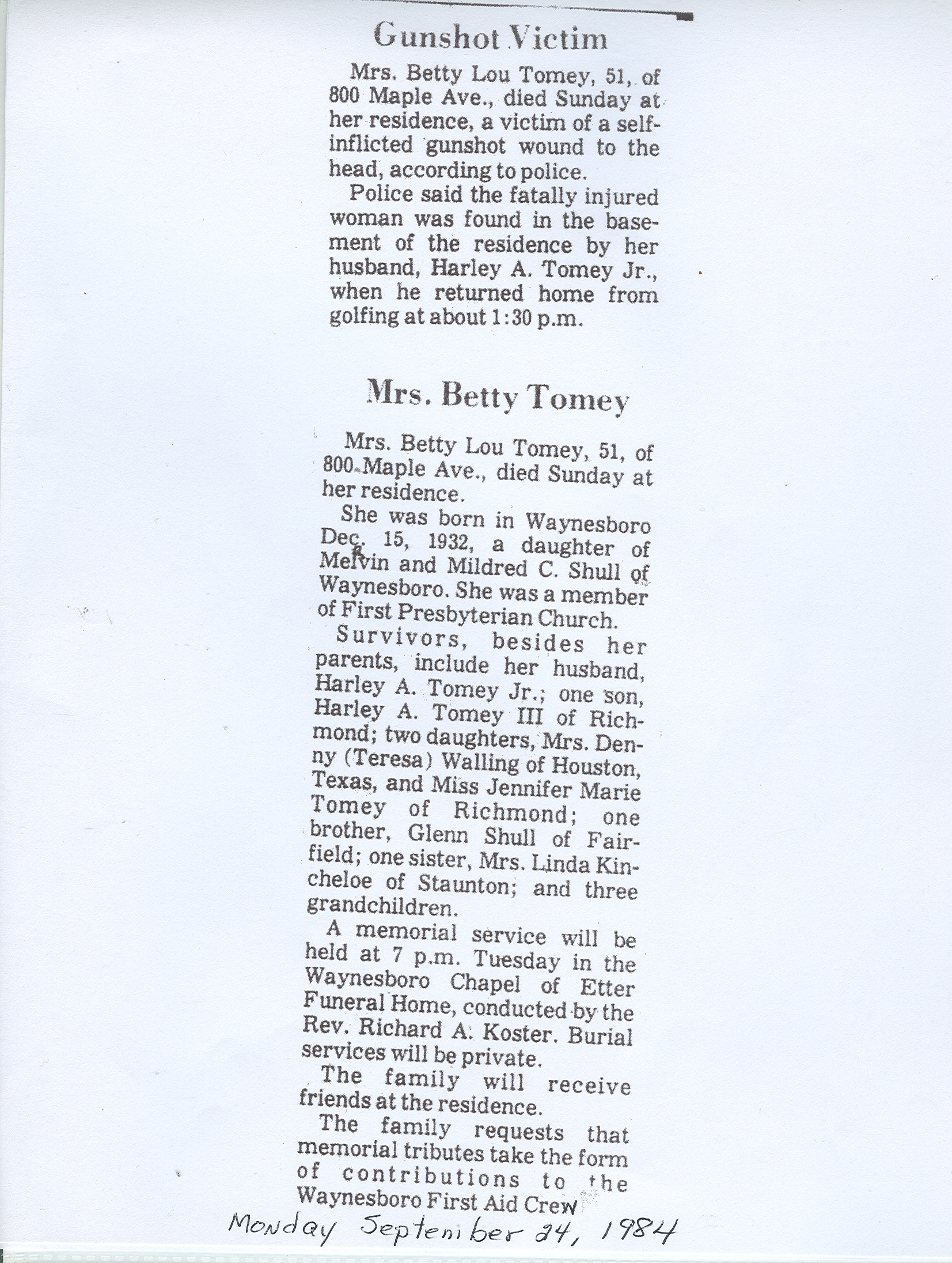 450. Obituary from Waynesboro, VA Newspaper, Betty Lou Tombey.