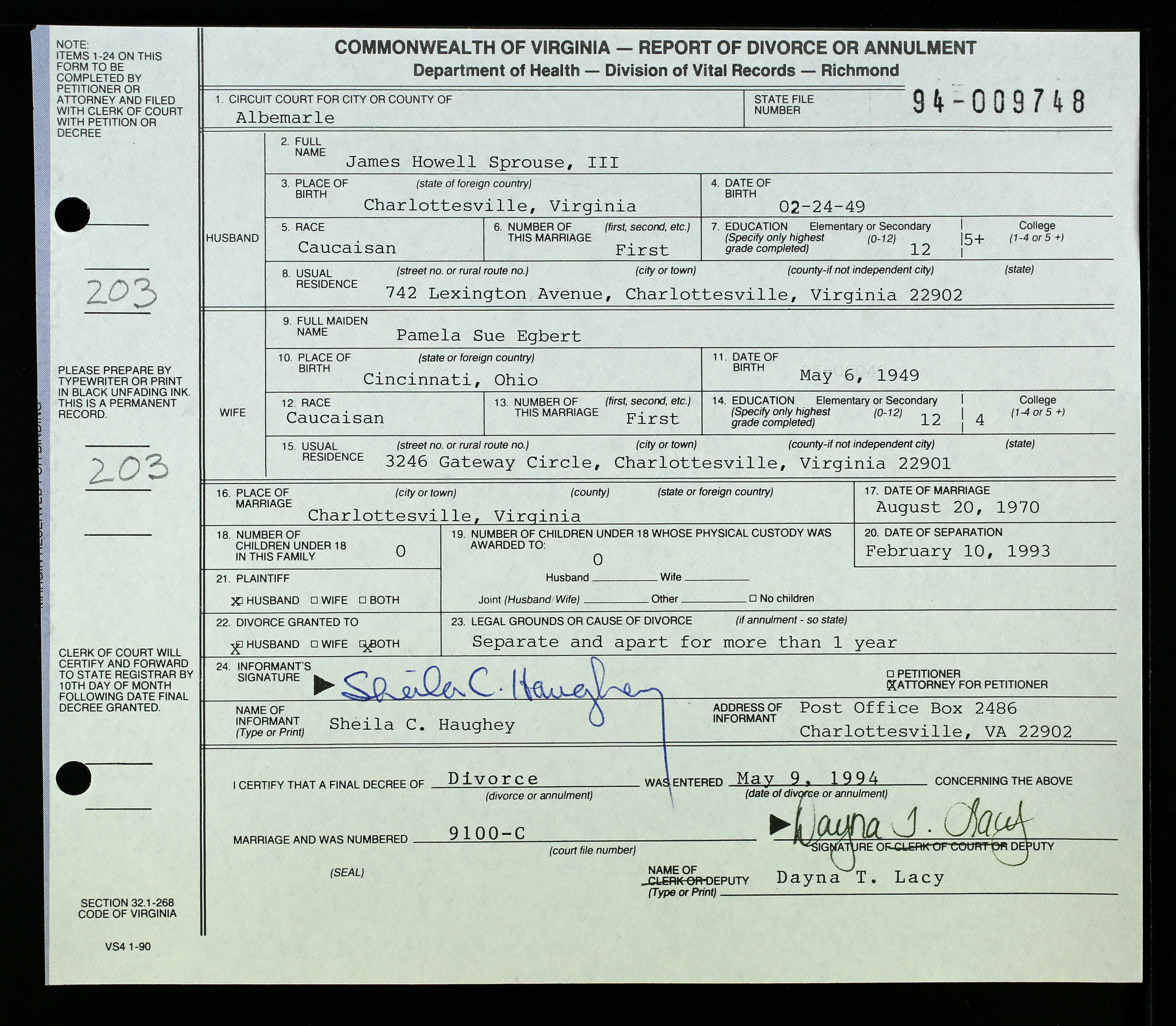472. Divorce Decree, Divorce Record, James Howell Sprouse III & Pamela Sue Egbert.