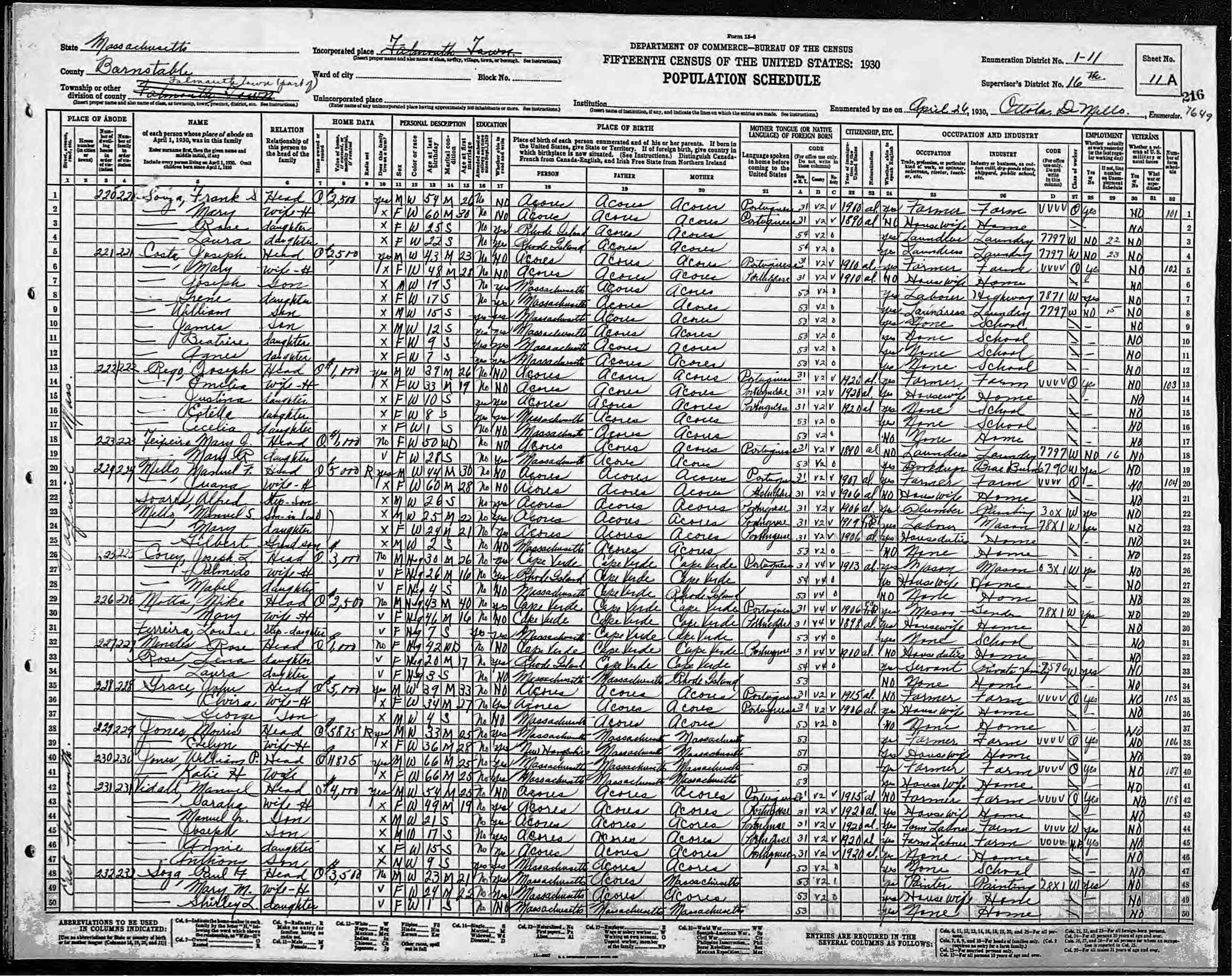 1. Census: Joseph Costa and family, 25 Apr 1940, Falmouth, Barnstable County, Massachusetts, USA. 231