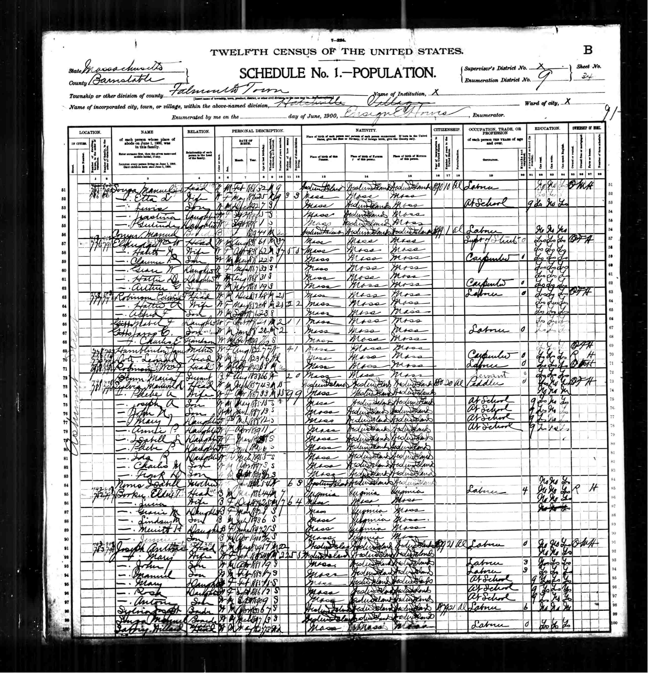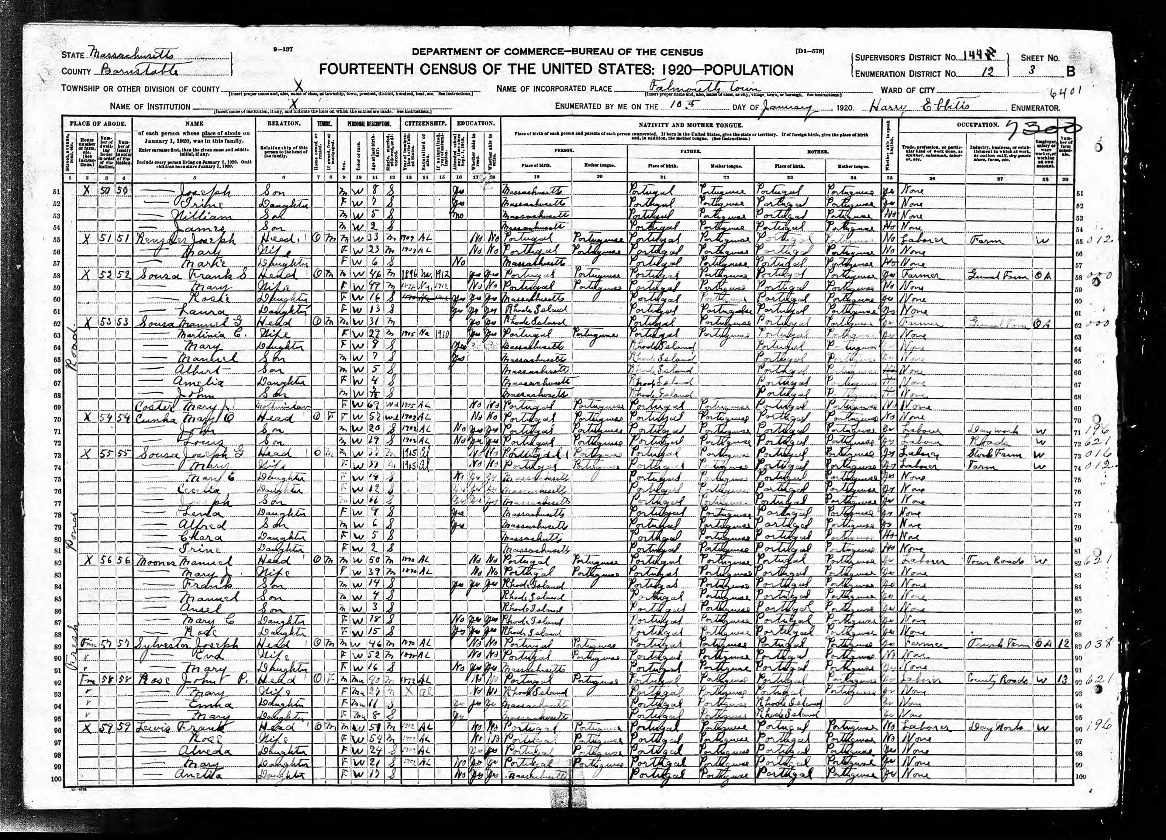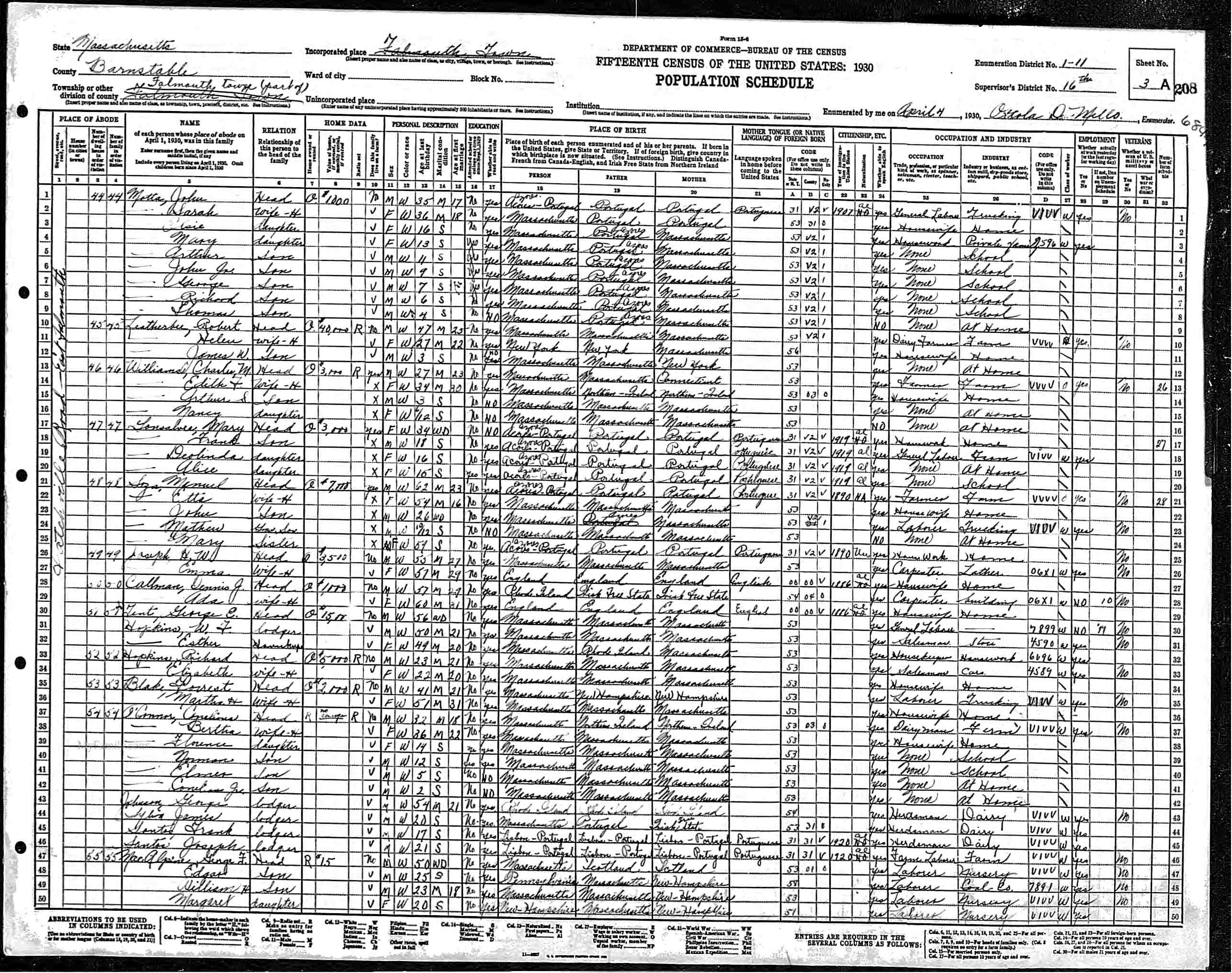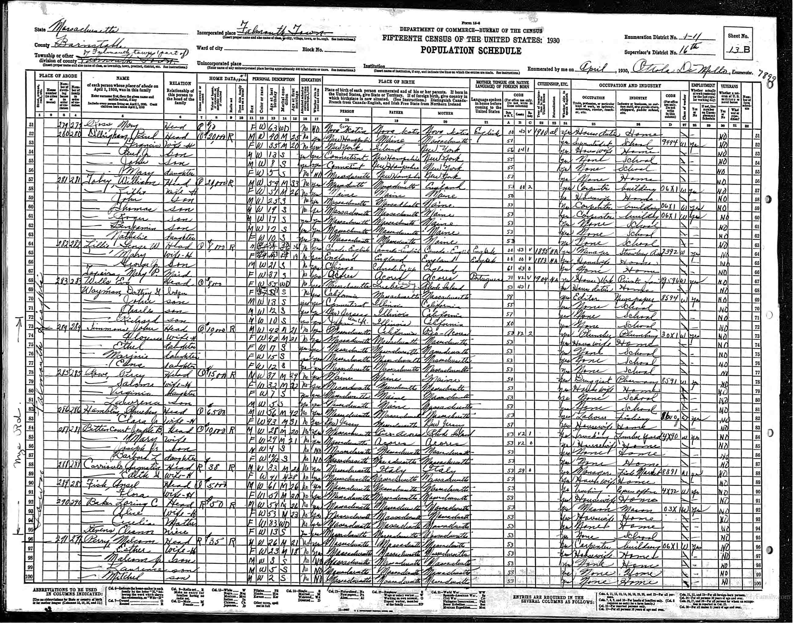 202. 1930 Massachusetts Census, Barnstable, Falmouth Township, ED 11, Sht 13B.