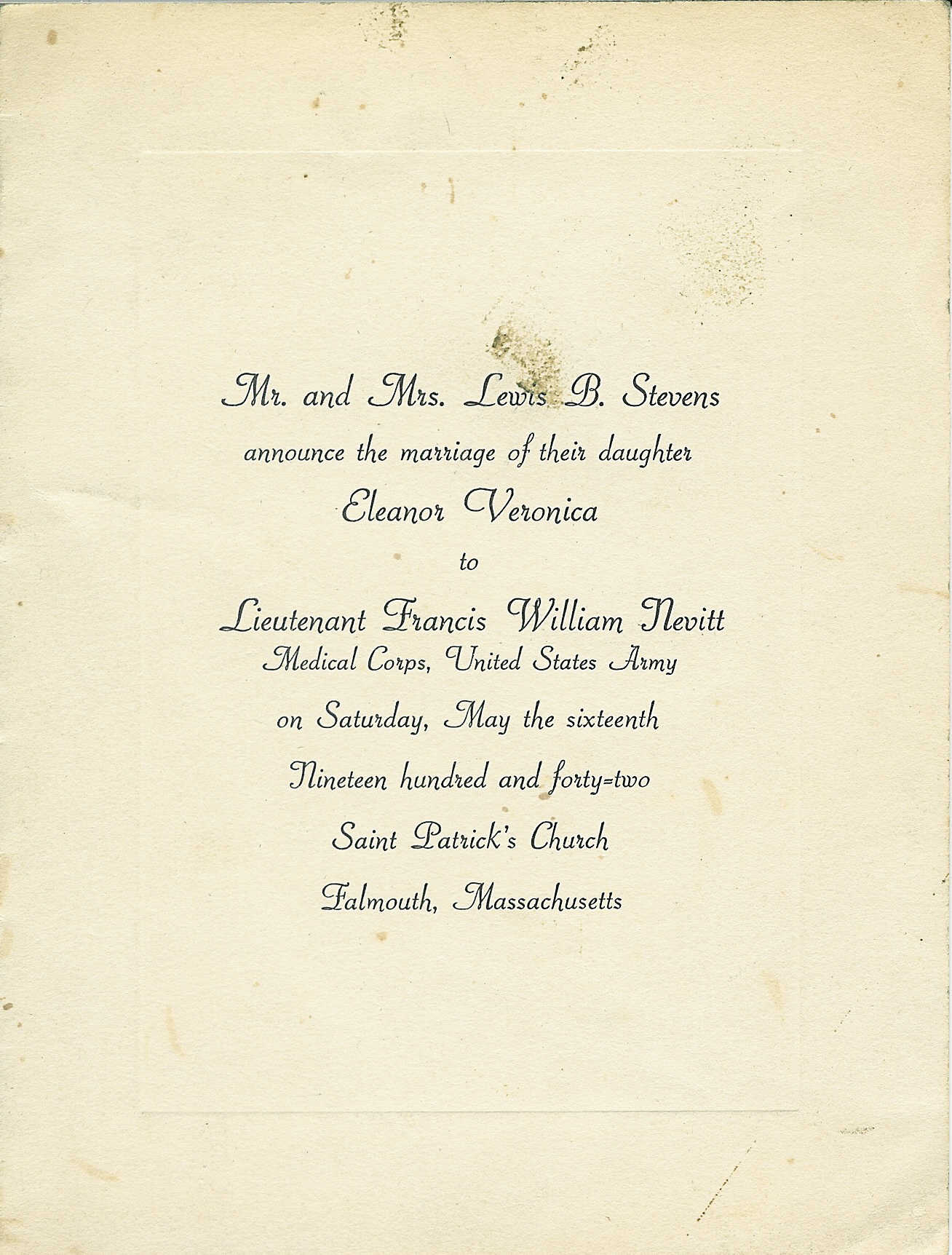 214. Marriage Announcement, Lewis B. Stevens Jr. & Irma Ruth Sprouse.