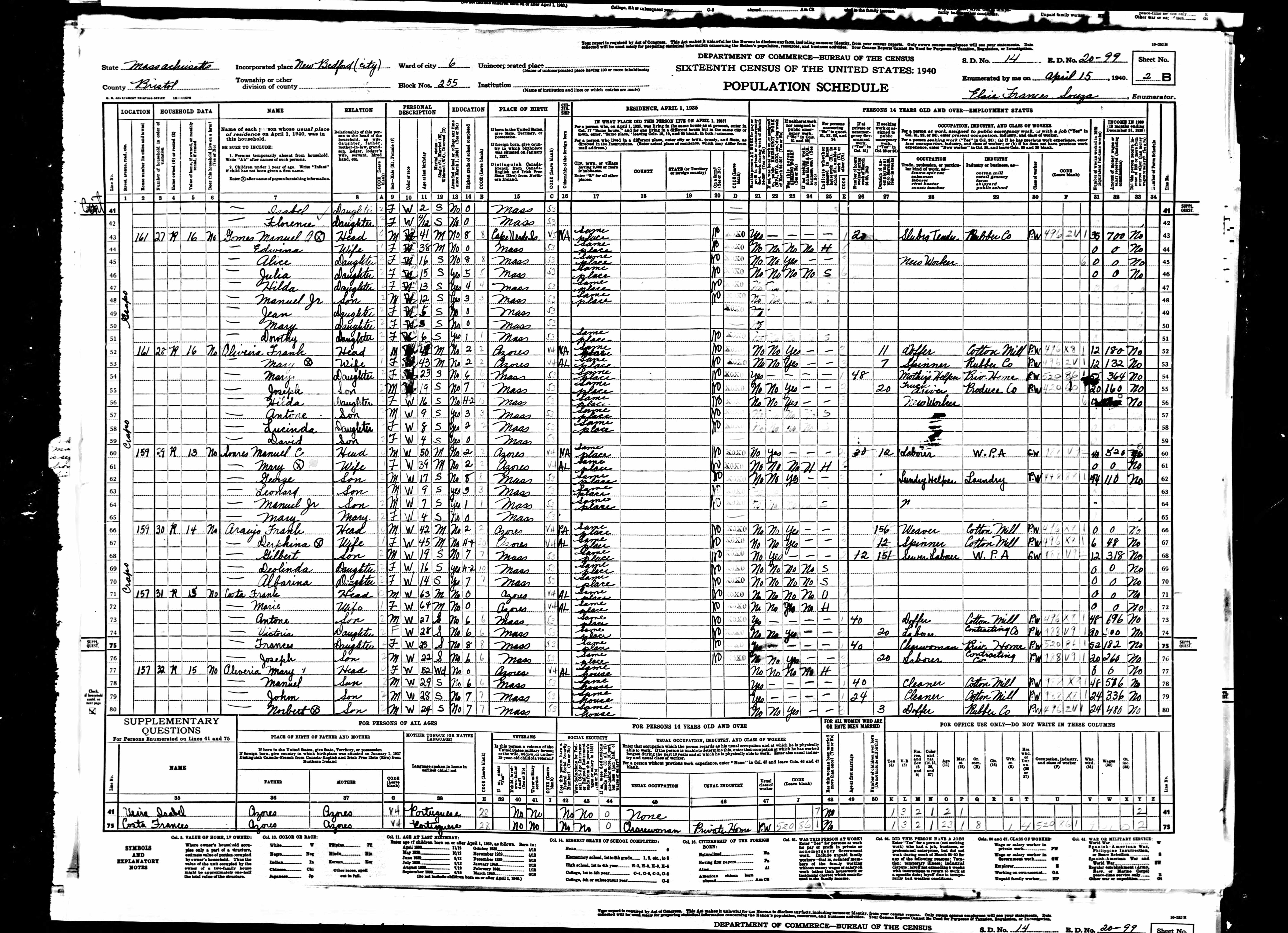 234. 1940 Massachusetts Census, Bristol, New Bedford, ED 20-99, Sht 2B, Image 4.
