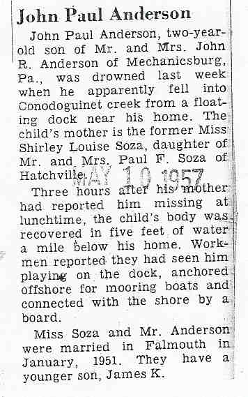 65. John Paul Anderson was born on 6 Dec 1954 in Wareham, Plymouth County, Massachusetts, USA, died on 29 Apr 1957 in Mechanicsburg, Cumberland County, Pennsylvania, USA,237 238 at age 2, and was buried on 2 May 1957 in Holy Cross, Harrisburg, Dauphin County, Pennsylvania, United States.
