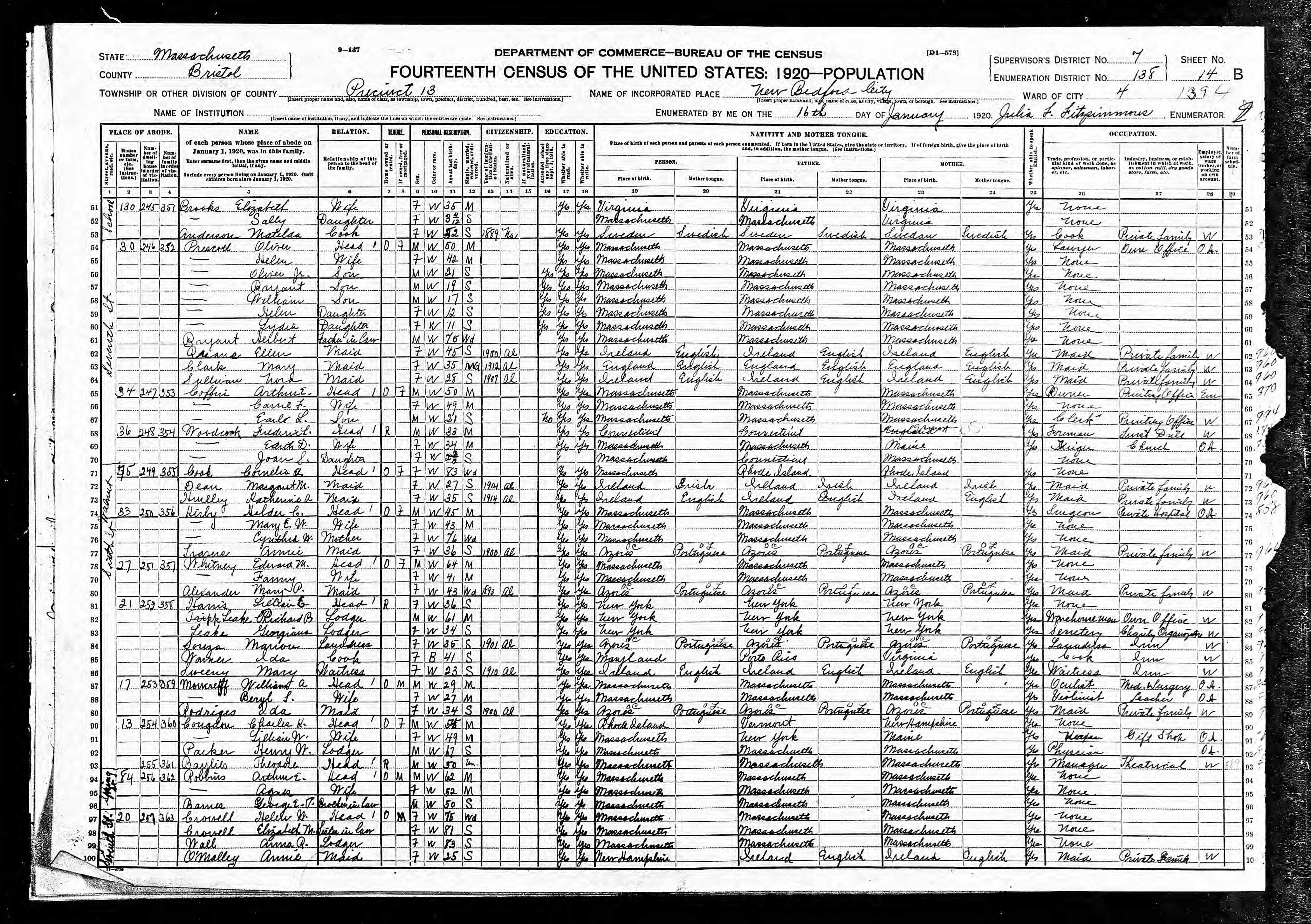 232. 1920 Massachusetts Census, Bristol, New Bedford, ED 146, Sht 9A.
