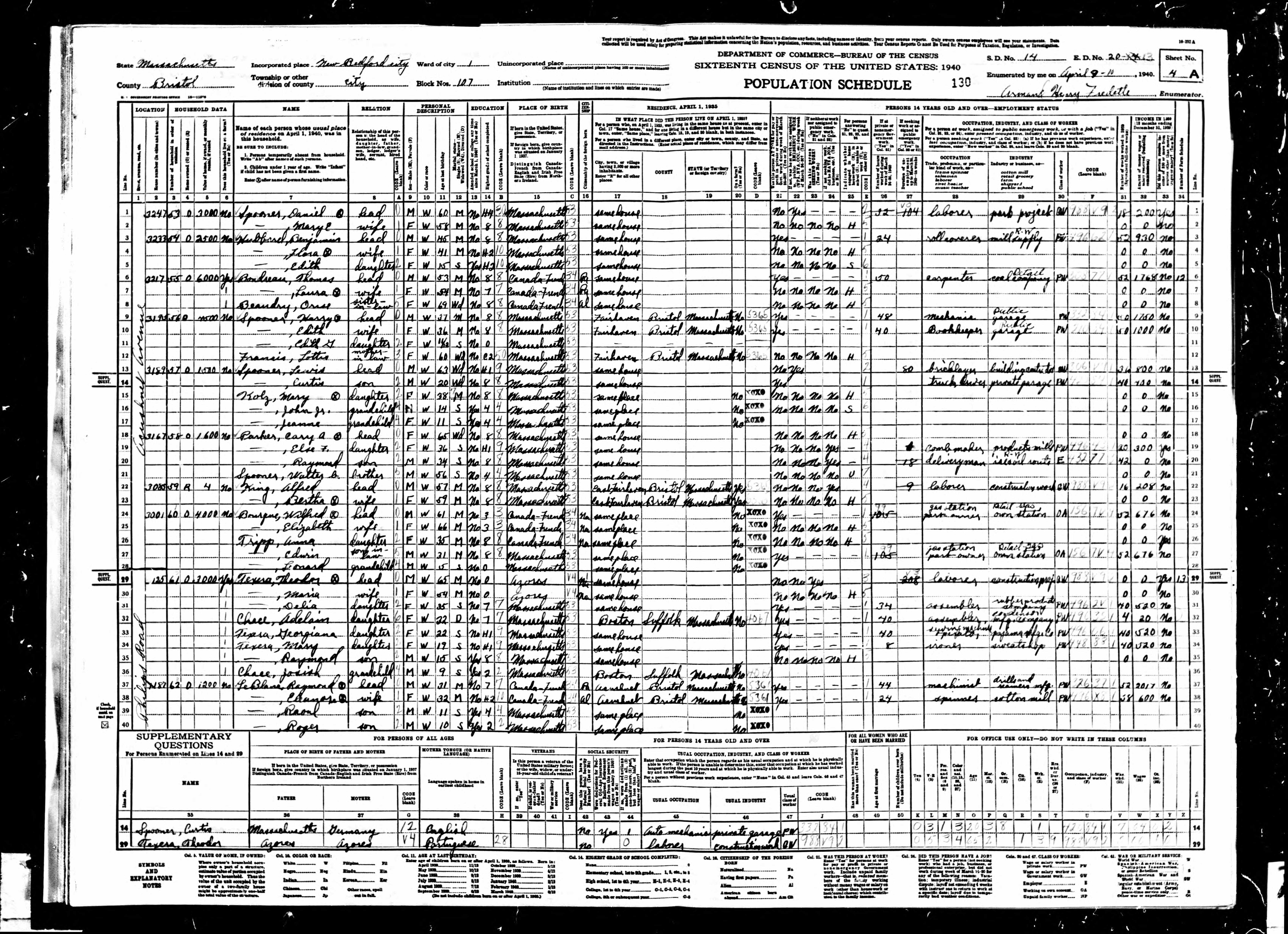 1. Census: Theodore Teixeira and family, 10 Apr 1940, New Bedford, Bristol County, Massachusetts, USA. 103