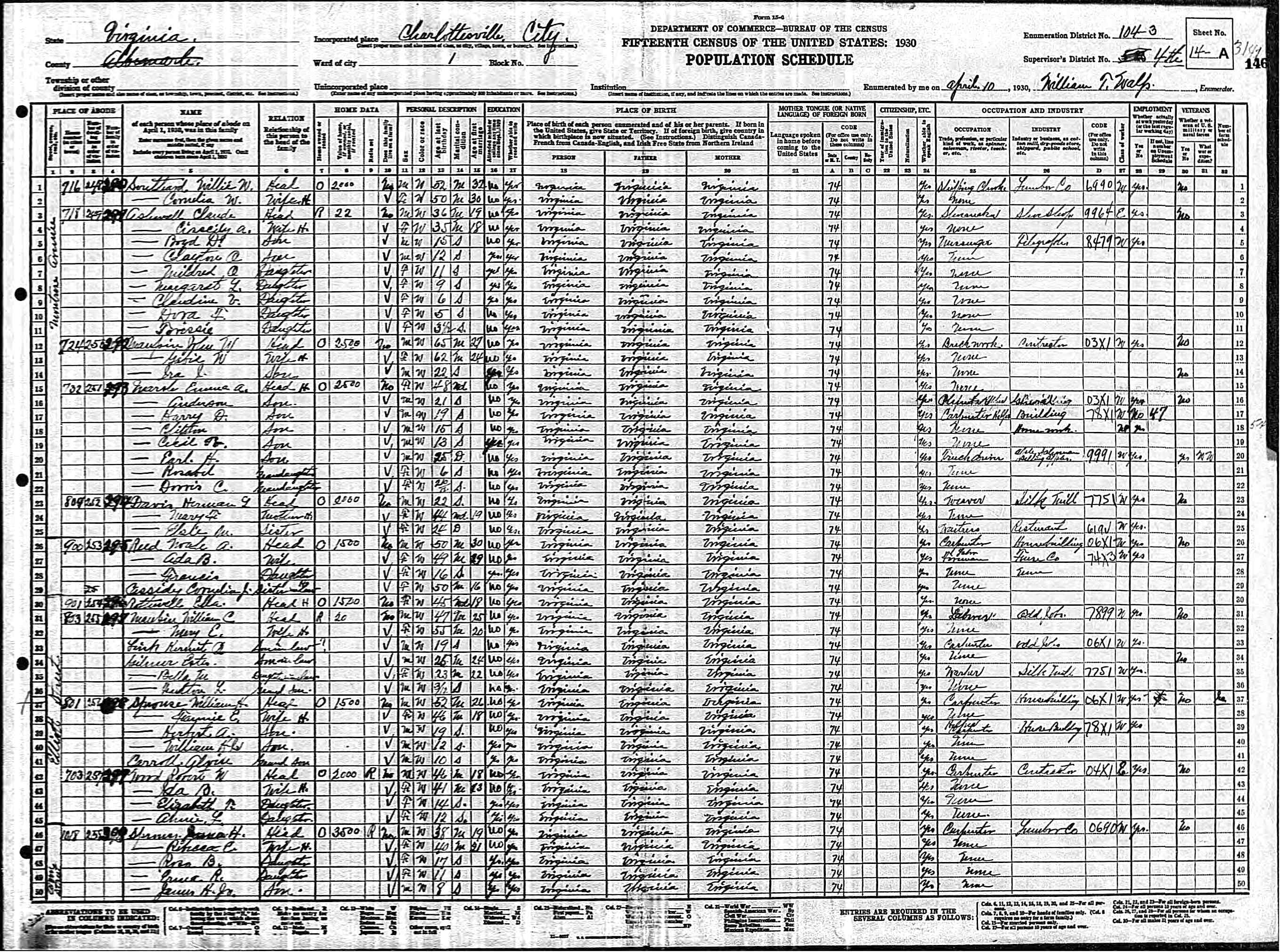 222. 1930 Virginia Census, Charlottesville Independent City ED 104-3 Sht 14A Images 27 & 28.