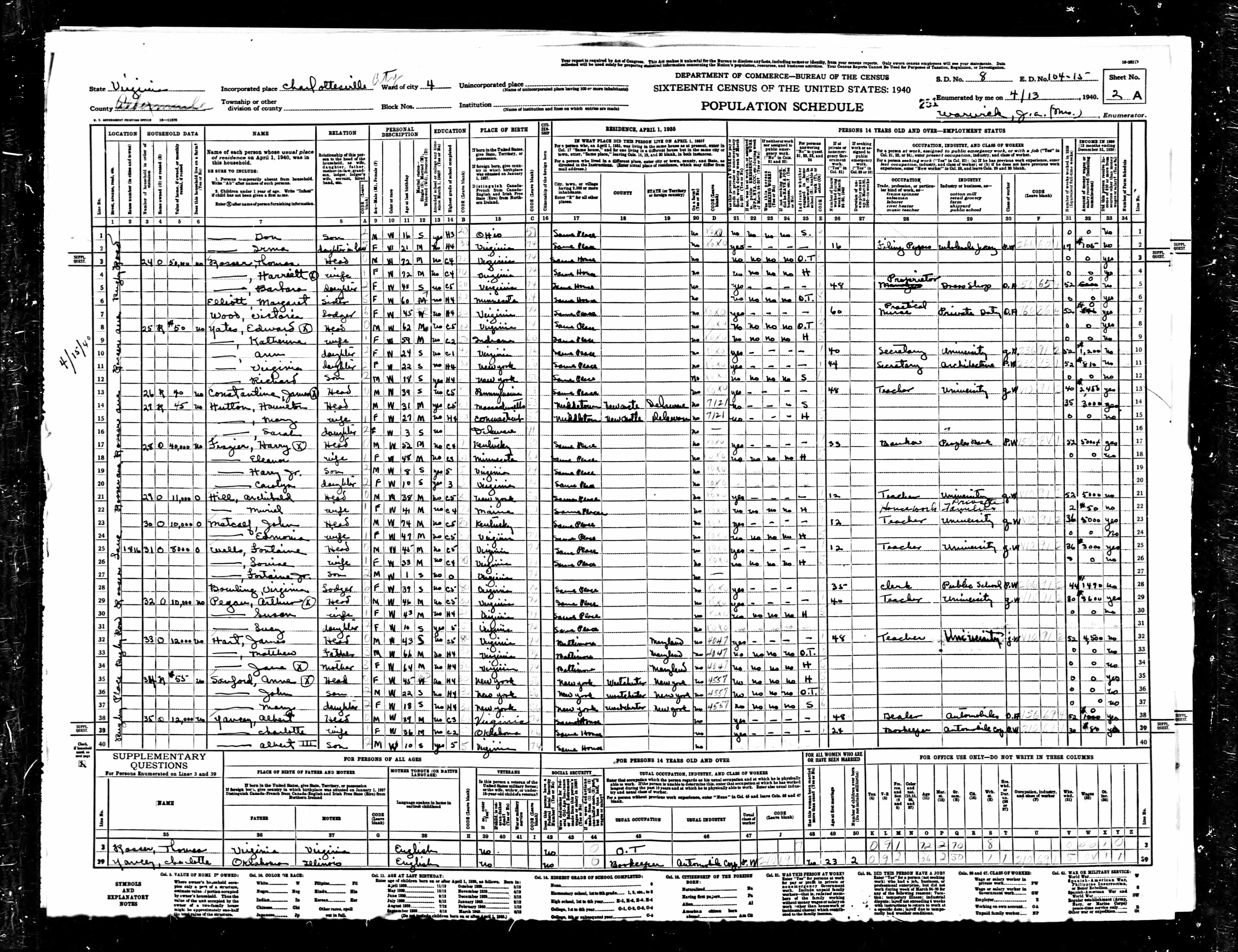 225. 1940 Virginia Census, Charlottesville City, Charlottesville, ED 104-15, Sht 2A, Image 3 Roll T627.