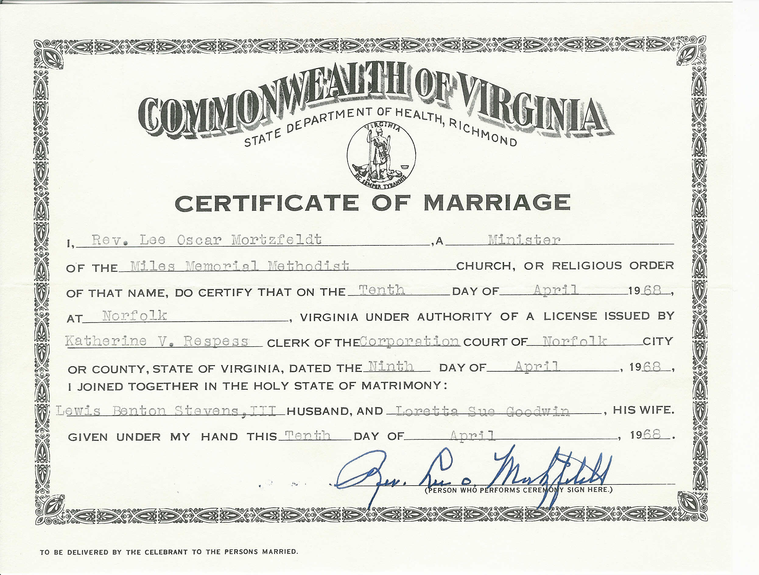 244. Augusta County Clerk of Court, Lewis Benton Stevens III & Loretta Sue Goodwin. Rev. Lee Oscar Mortzfeldt Miles Memorial Methodist Church. Wet night. In attendance were: