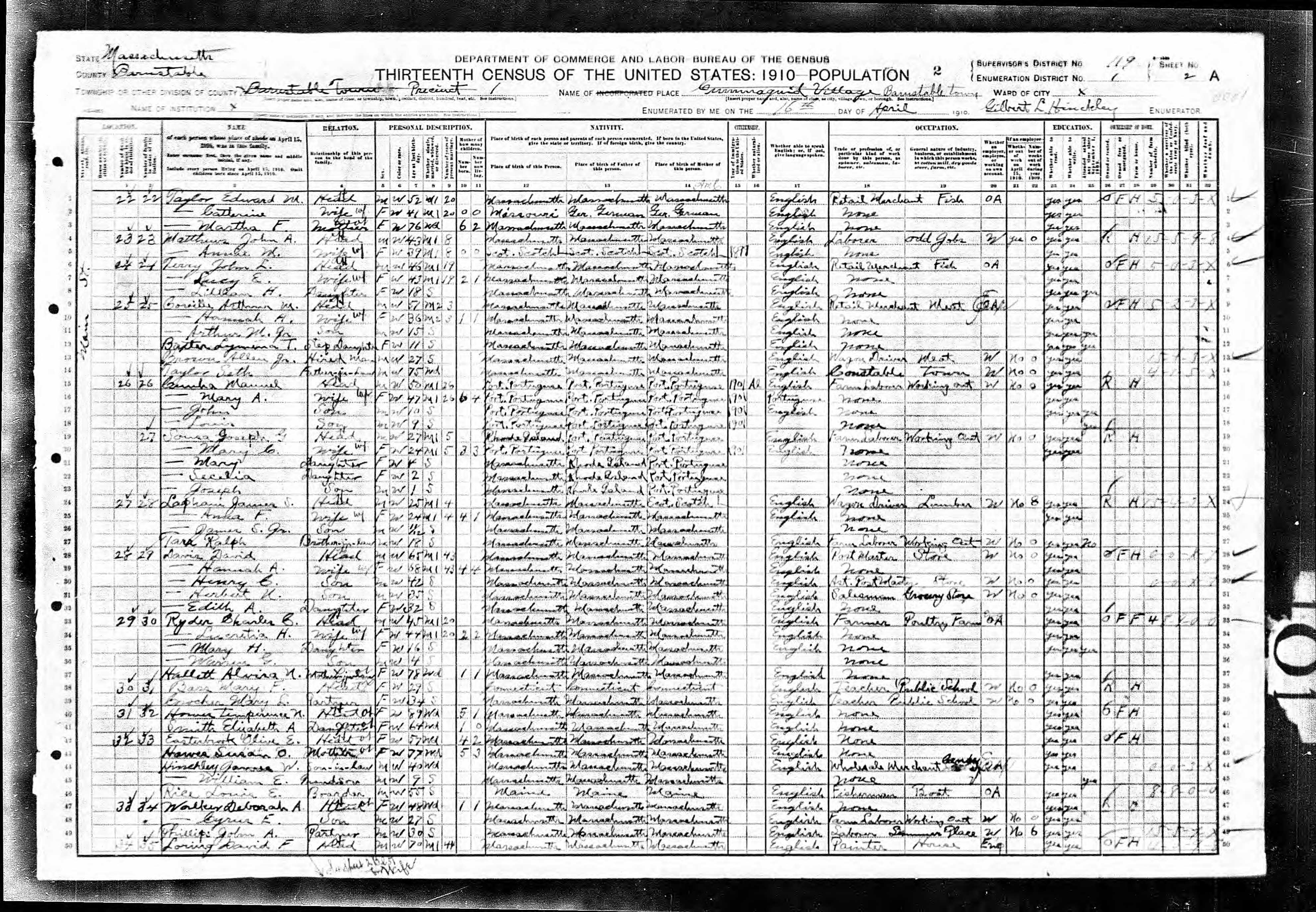 21. 1910 Massachusetts Census, Barnstable, Barnstable, ED01, Sht 2A.