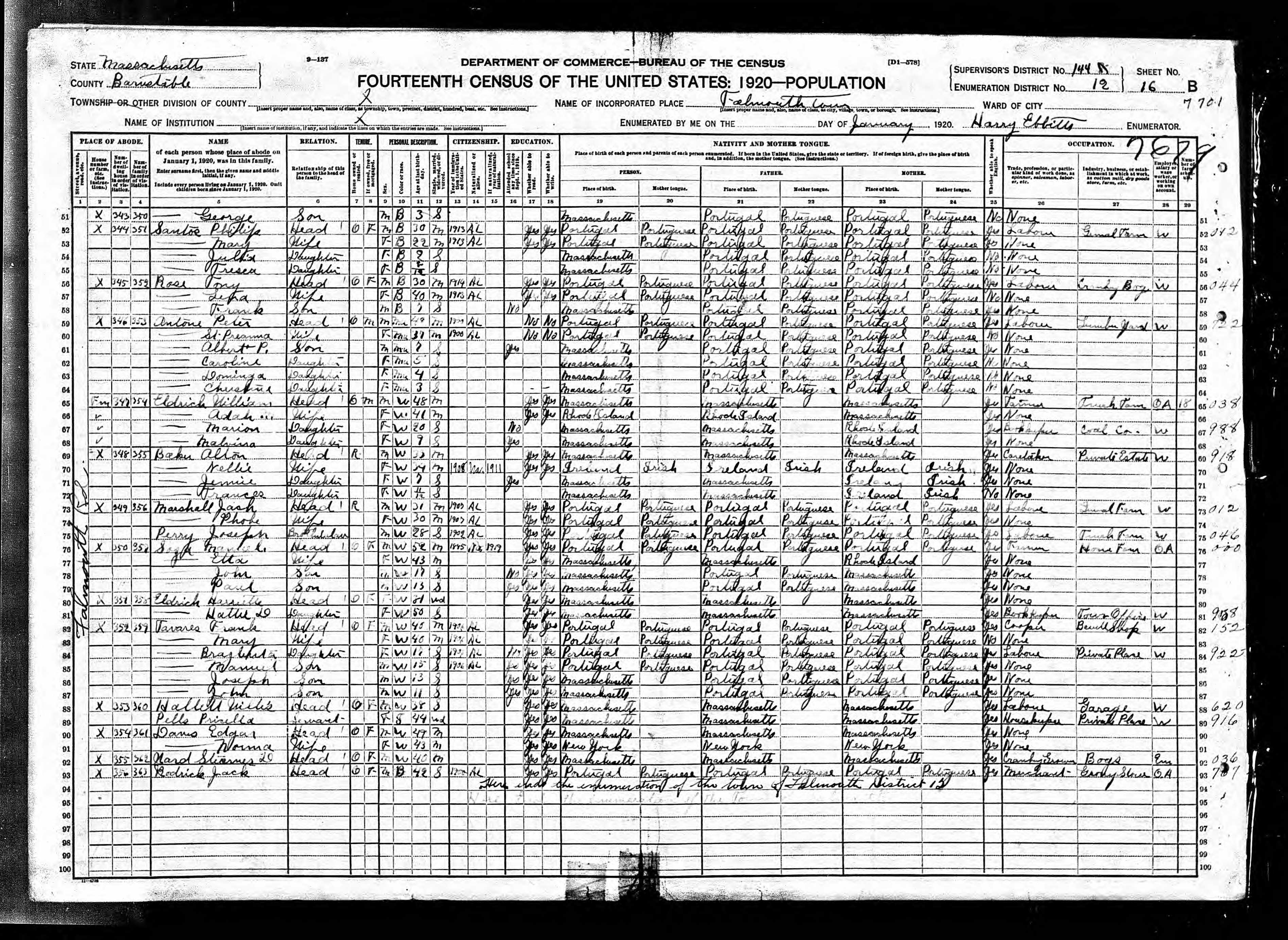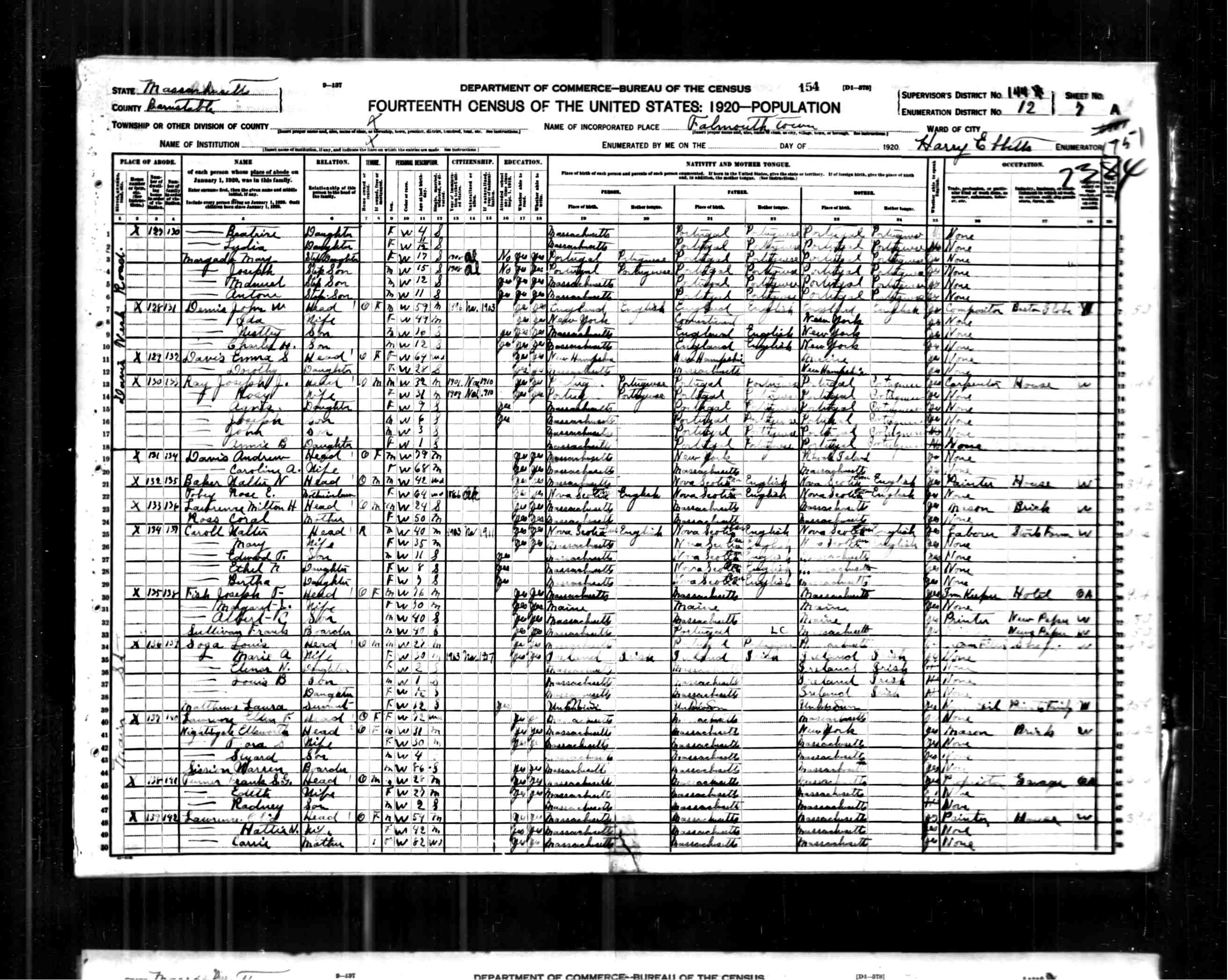 22. 1920 Massachusetts Census, Barnstable, Falmouth, ED12, Sht 3B.