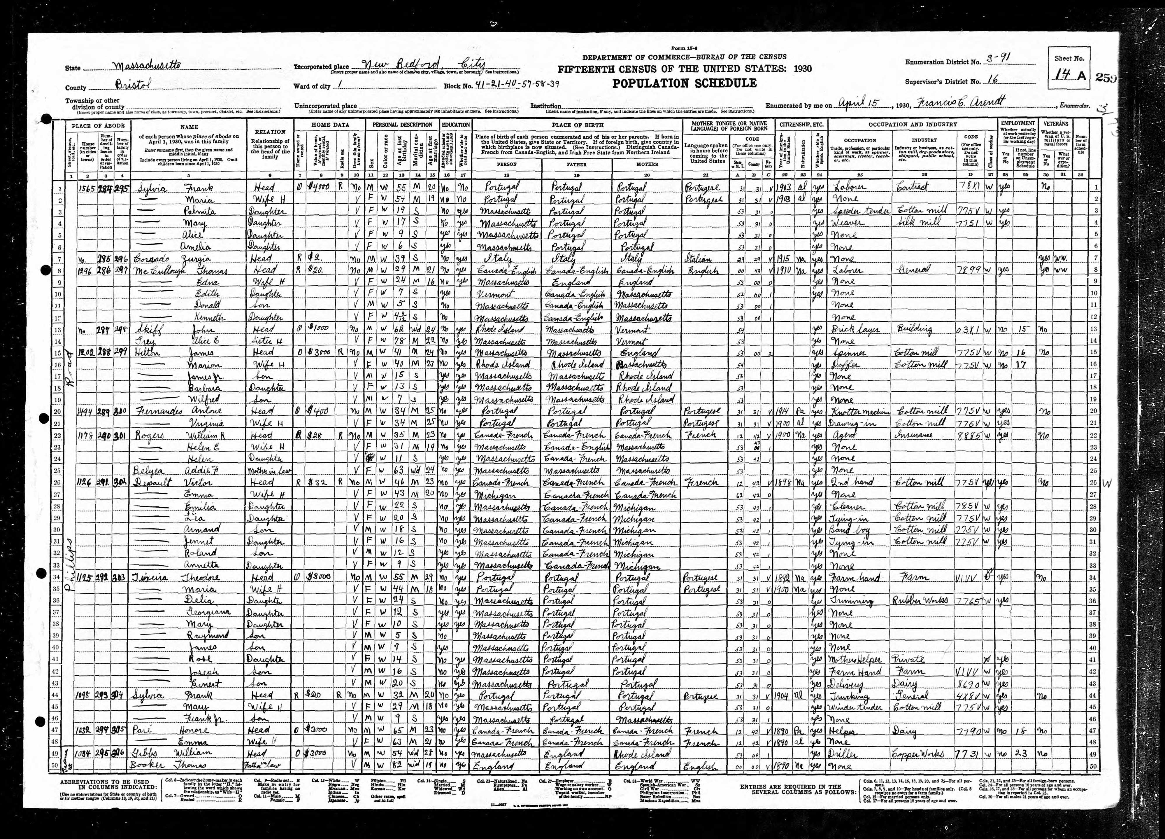 233. 1930 Massachusetts Census, Bristol, New Bedford, ED 149, Sht 15B.