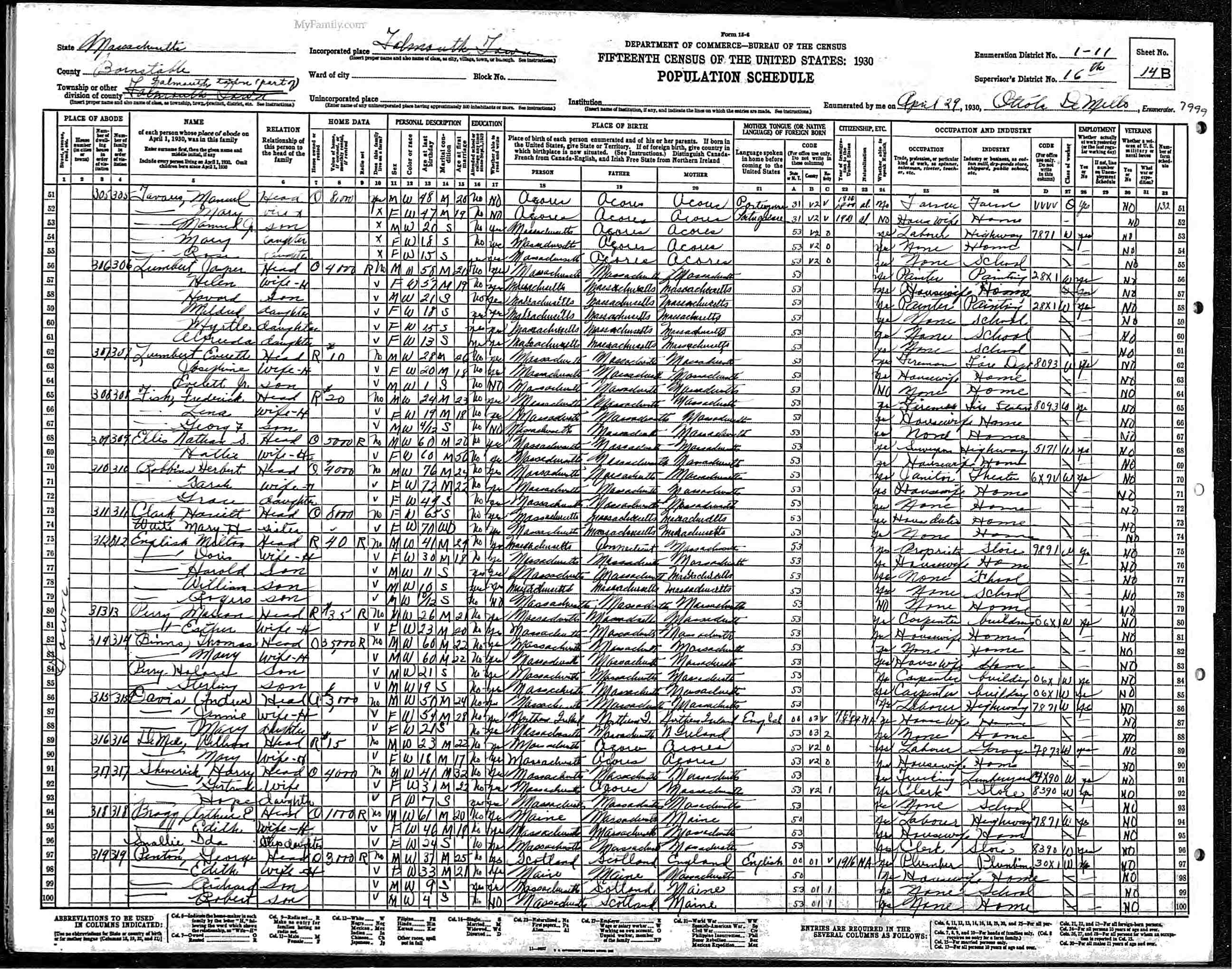202. 1930 Massachusetts Census, Barnstable, Falmouth Township, ED 11, Sht 13B.