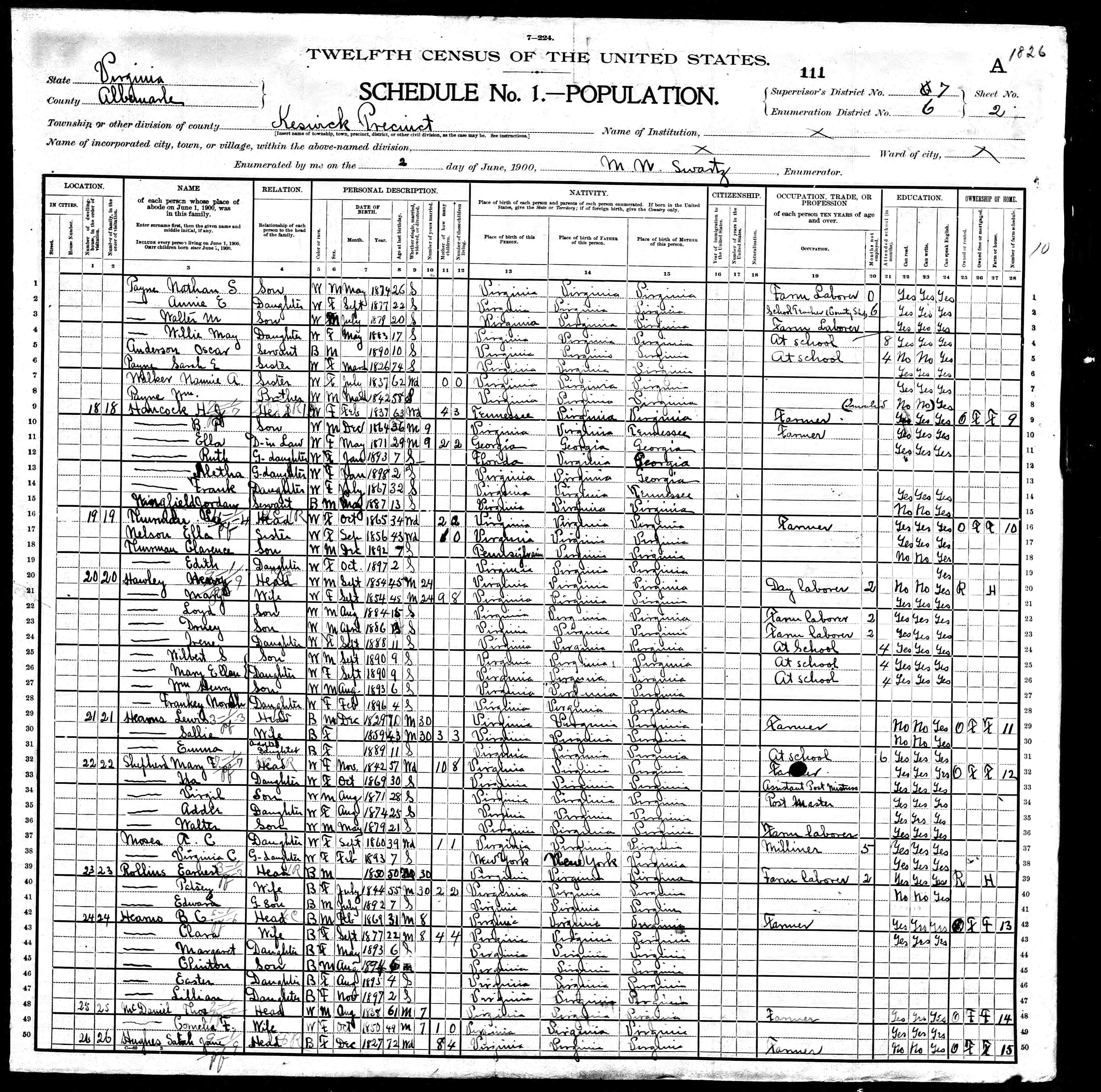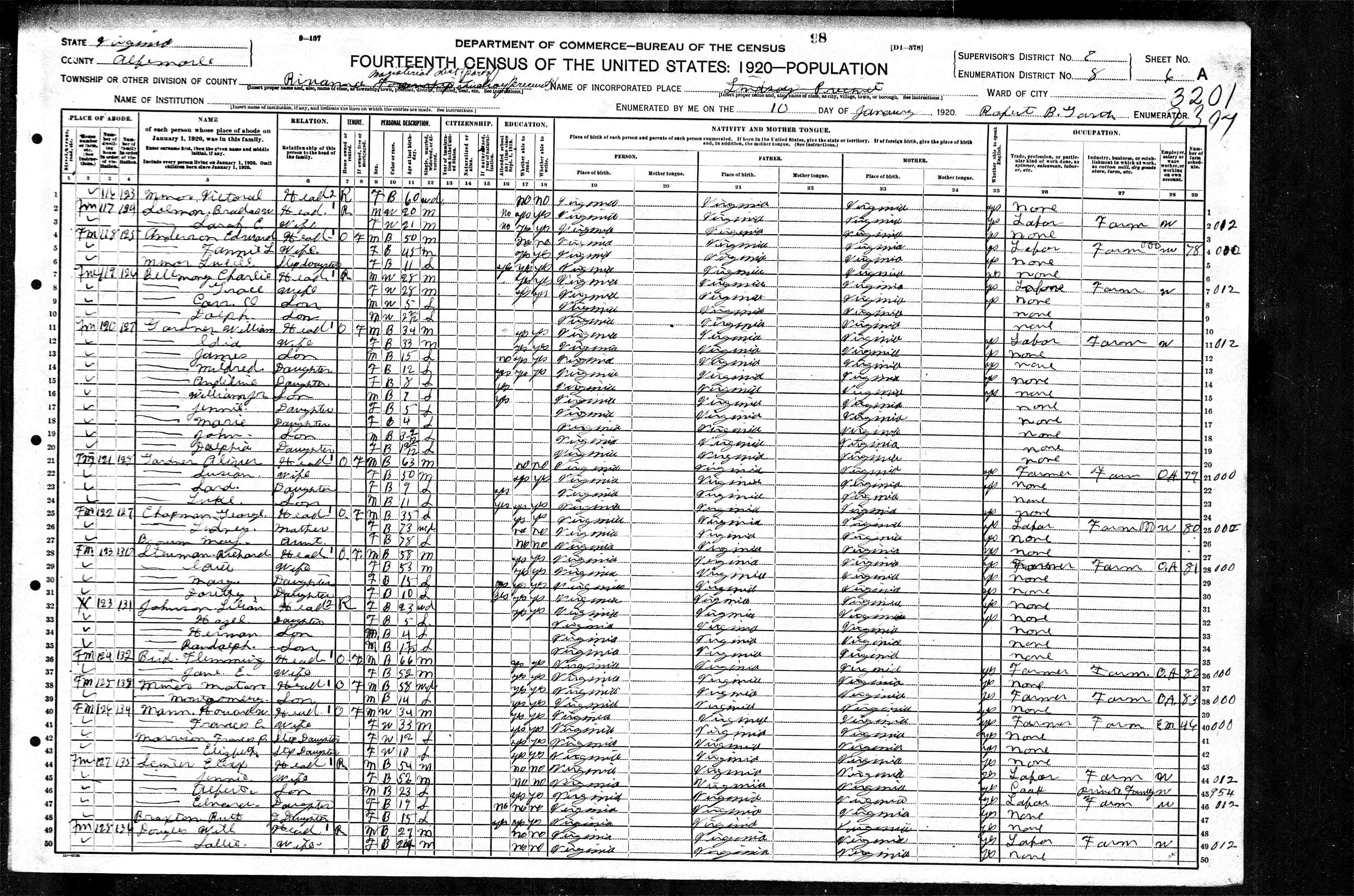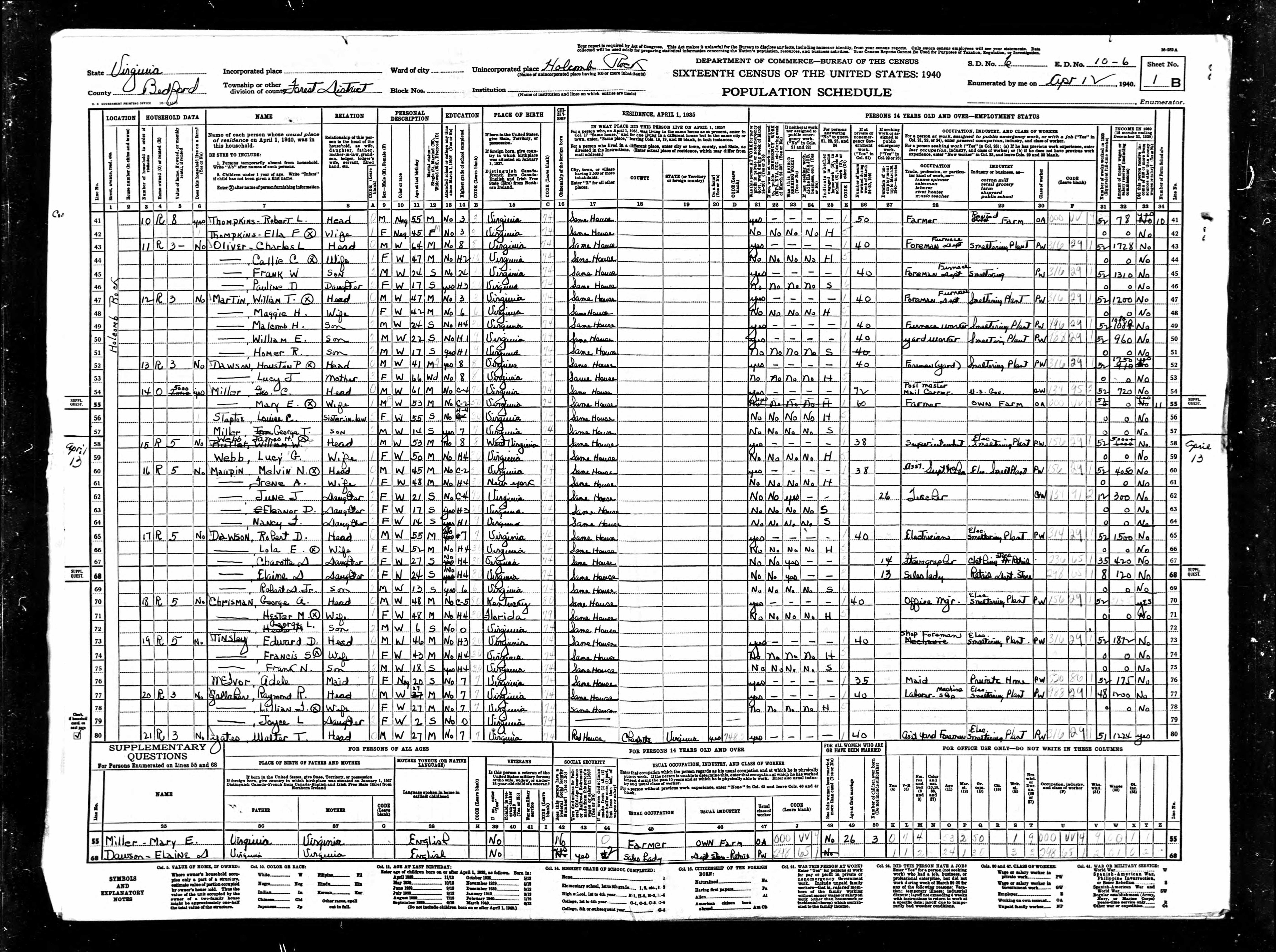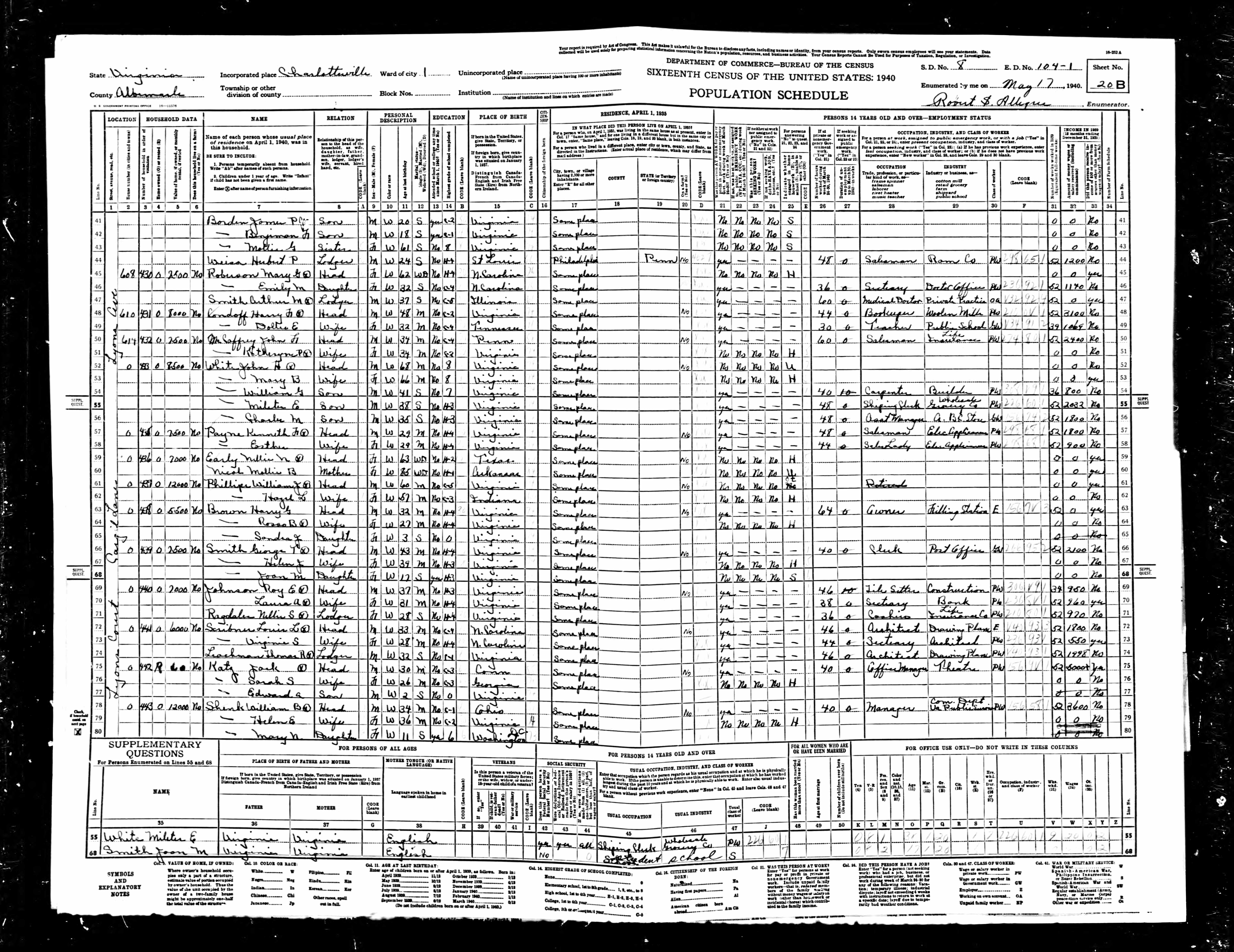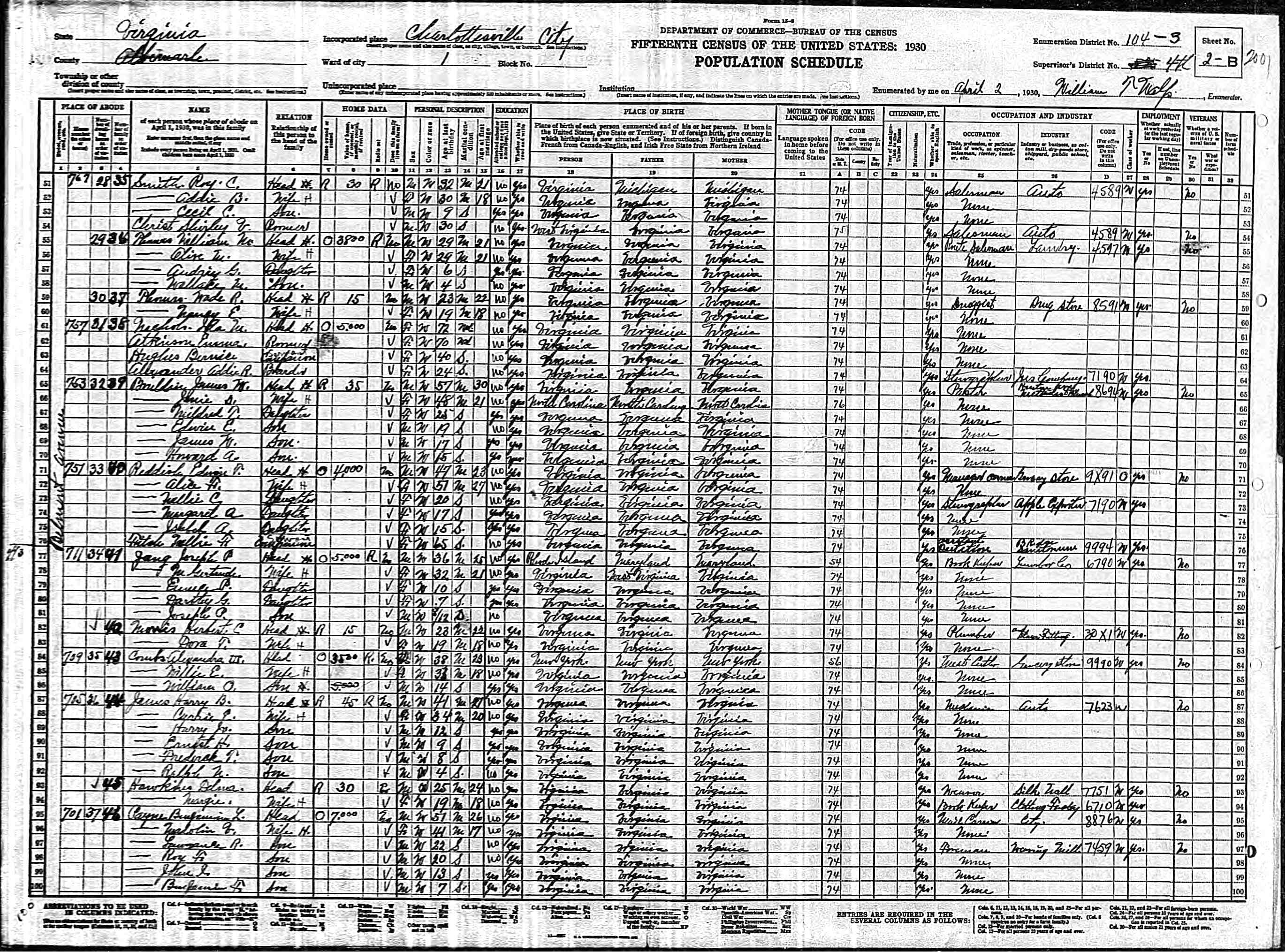 1074. 1940 Virginia Census, Albemarle, Rivanna, ED 2-6, Sht 11B, Image 22 Roll T627.
