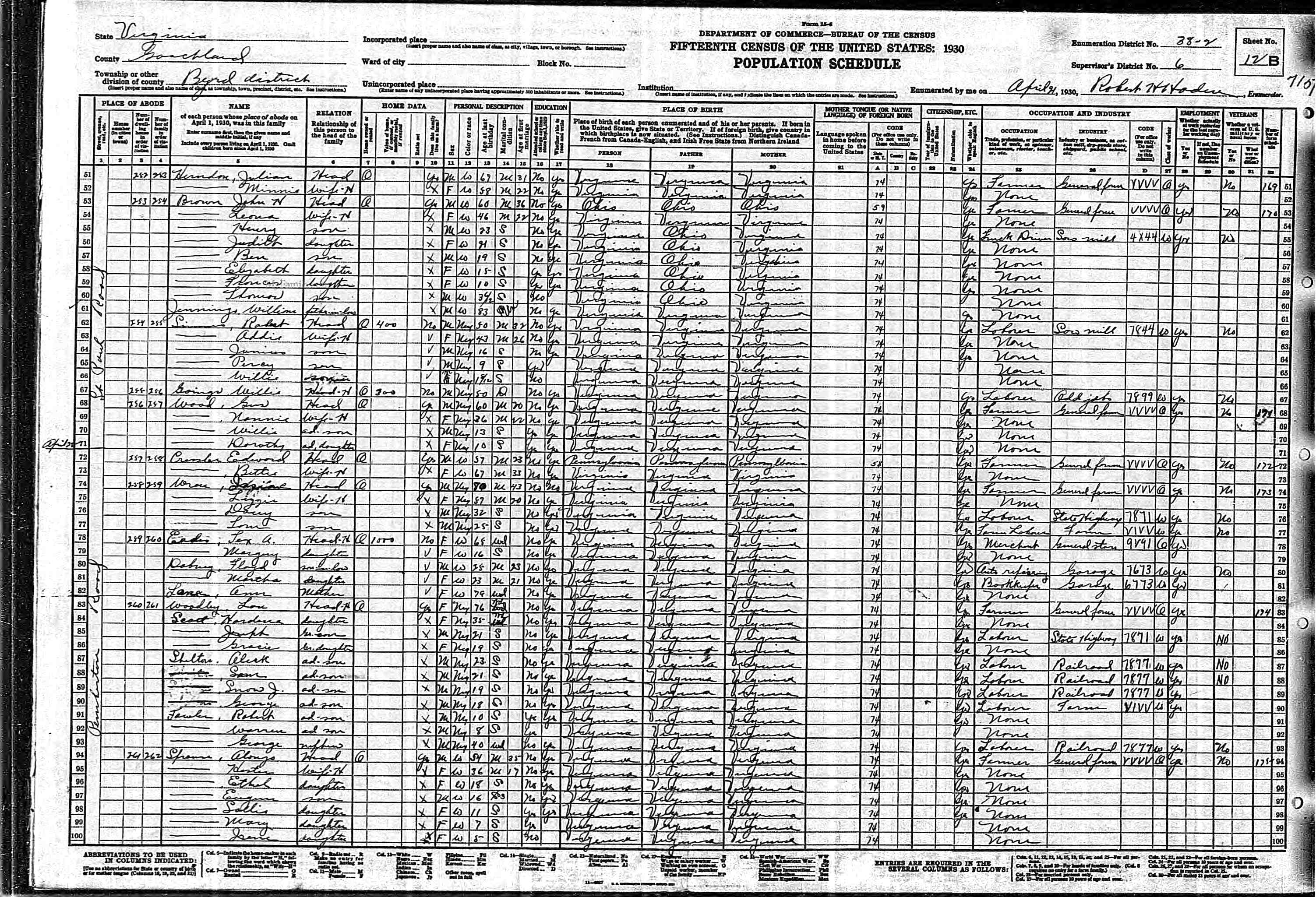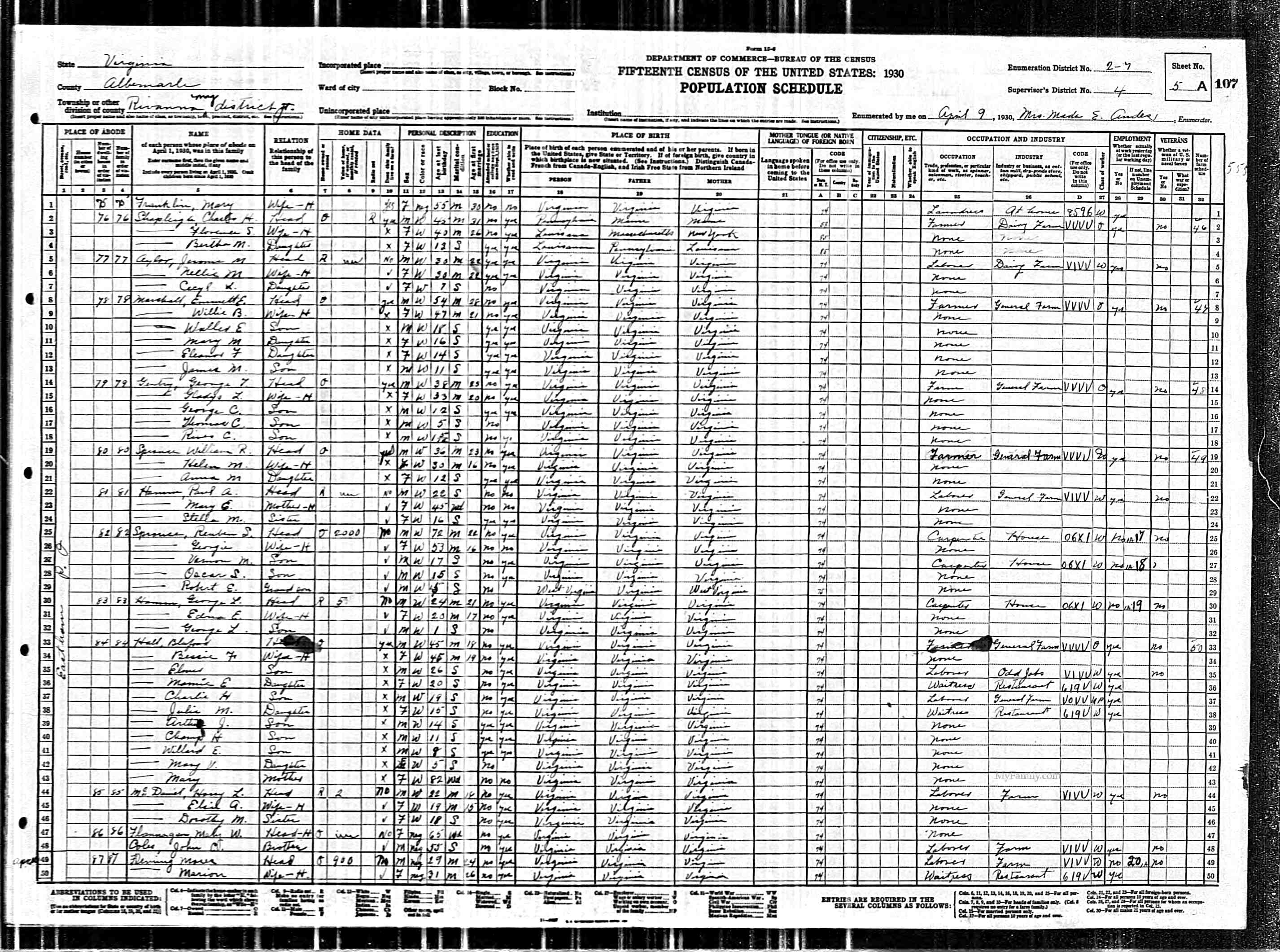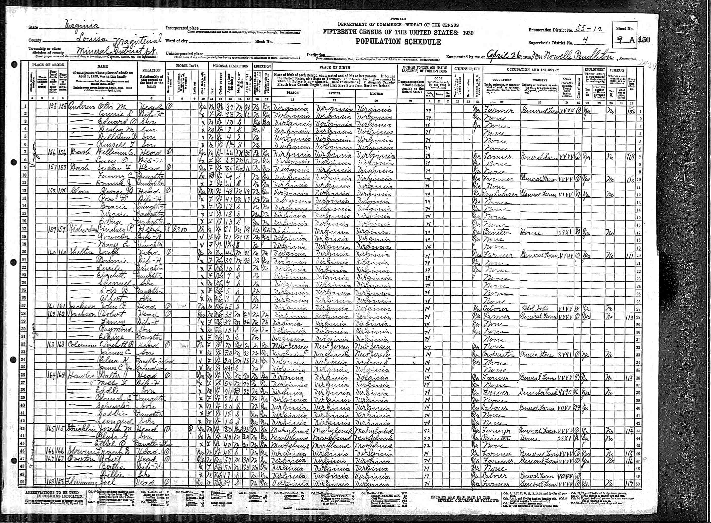 1064. 1930 Virginia Census, Goochland, Byrd, ED 1, Sht 9A, Image 17 Roll T626_2445, p. 9A, ED 1, Image 18.