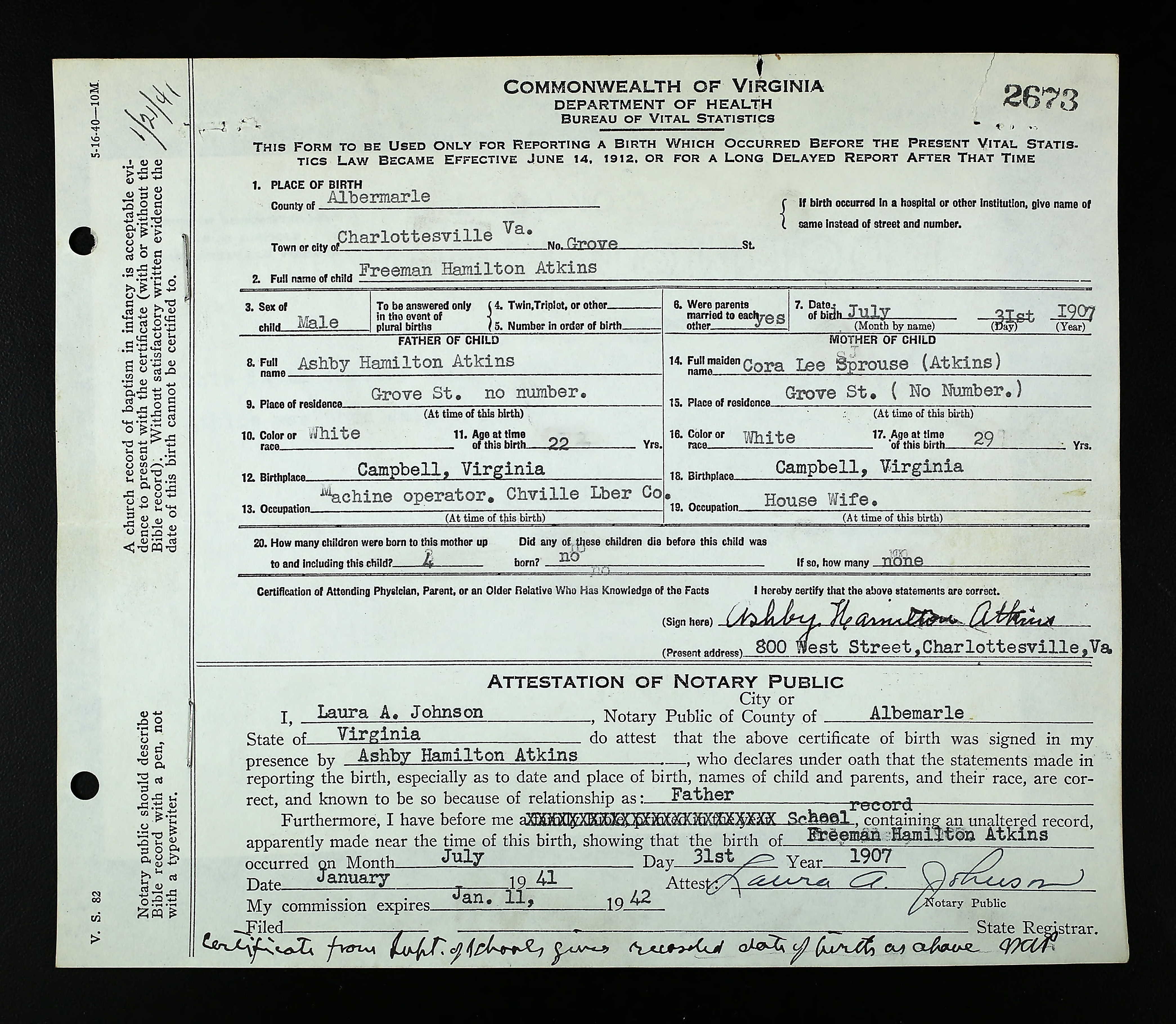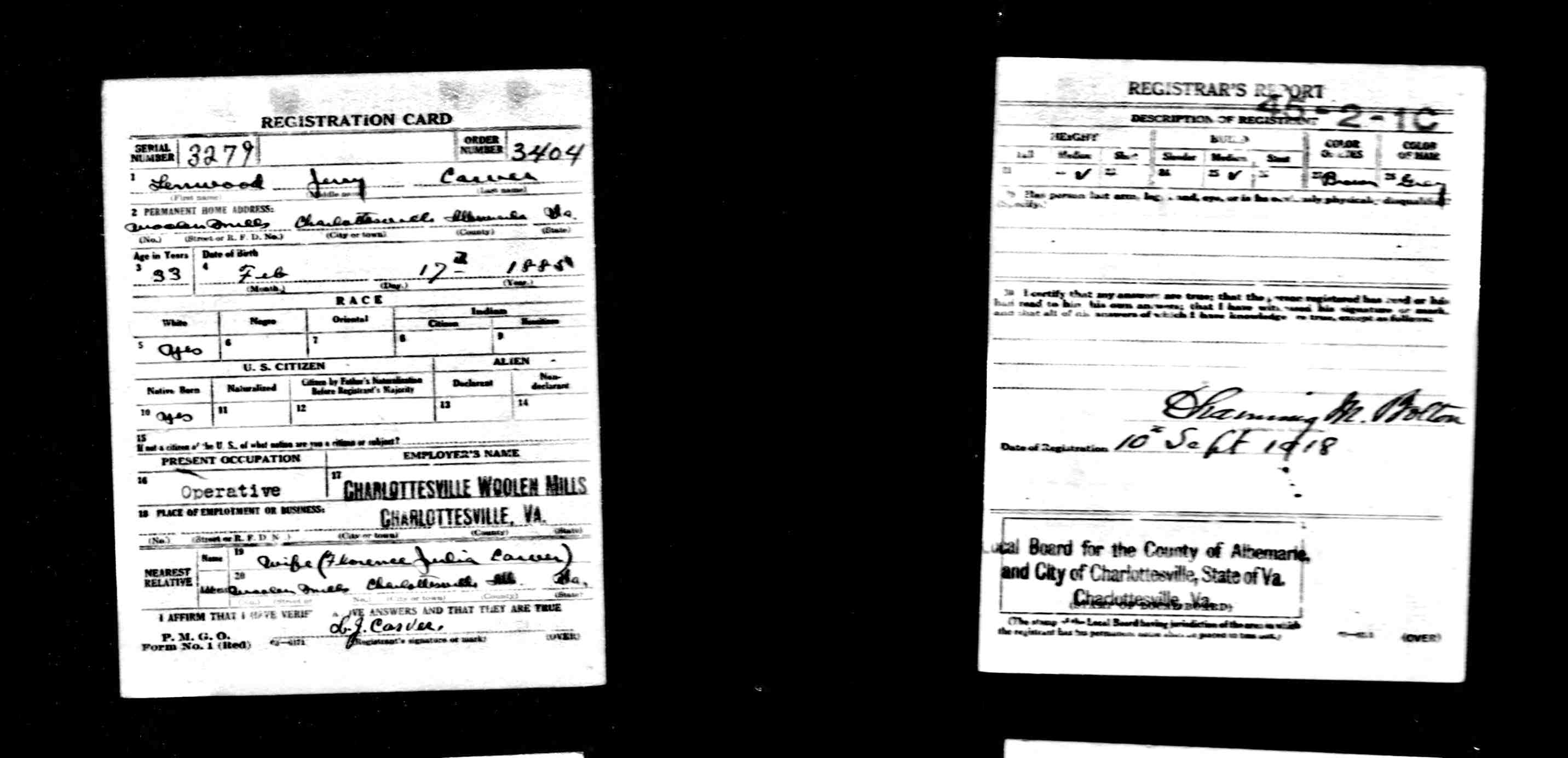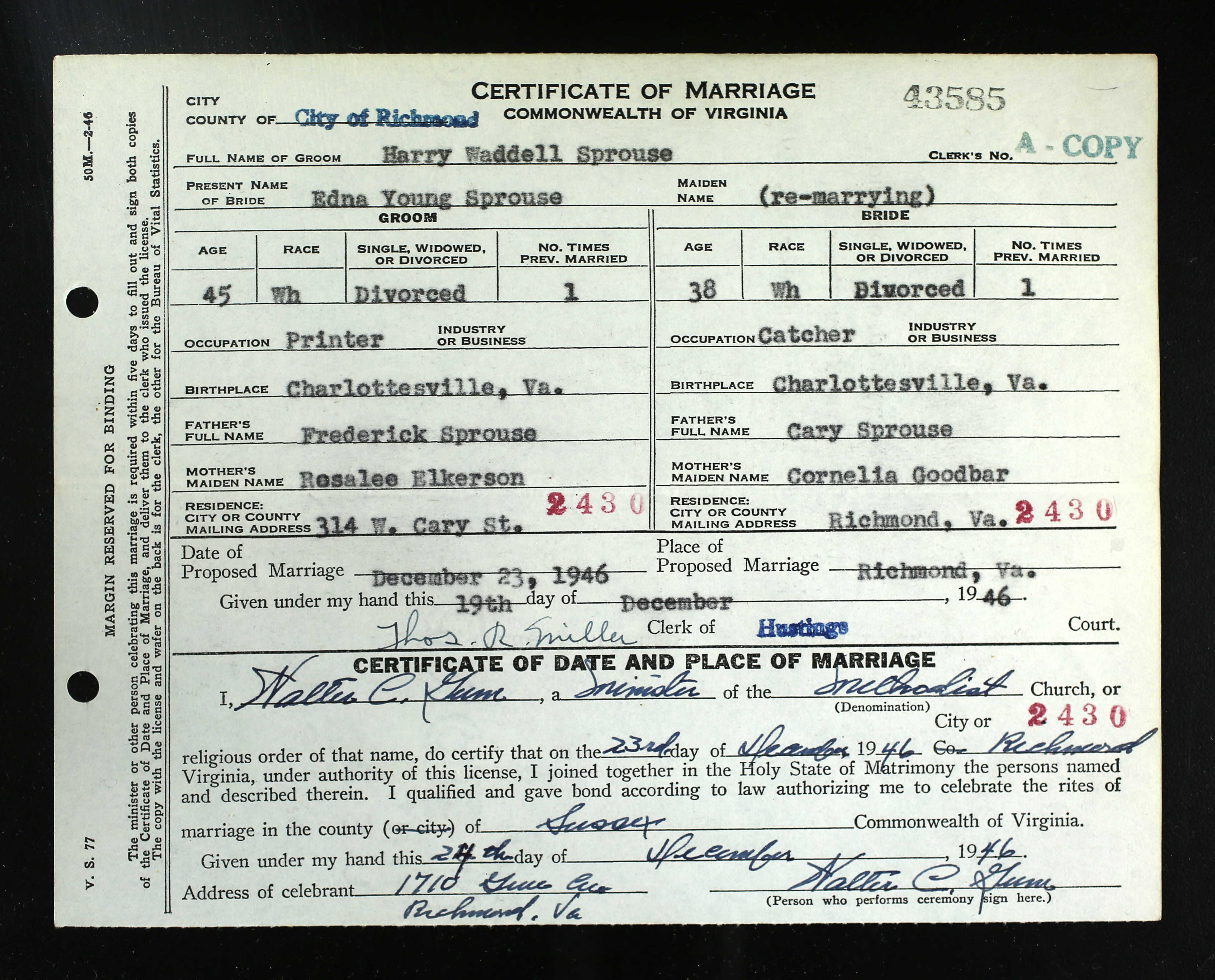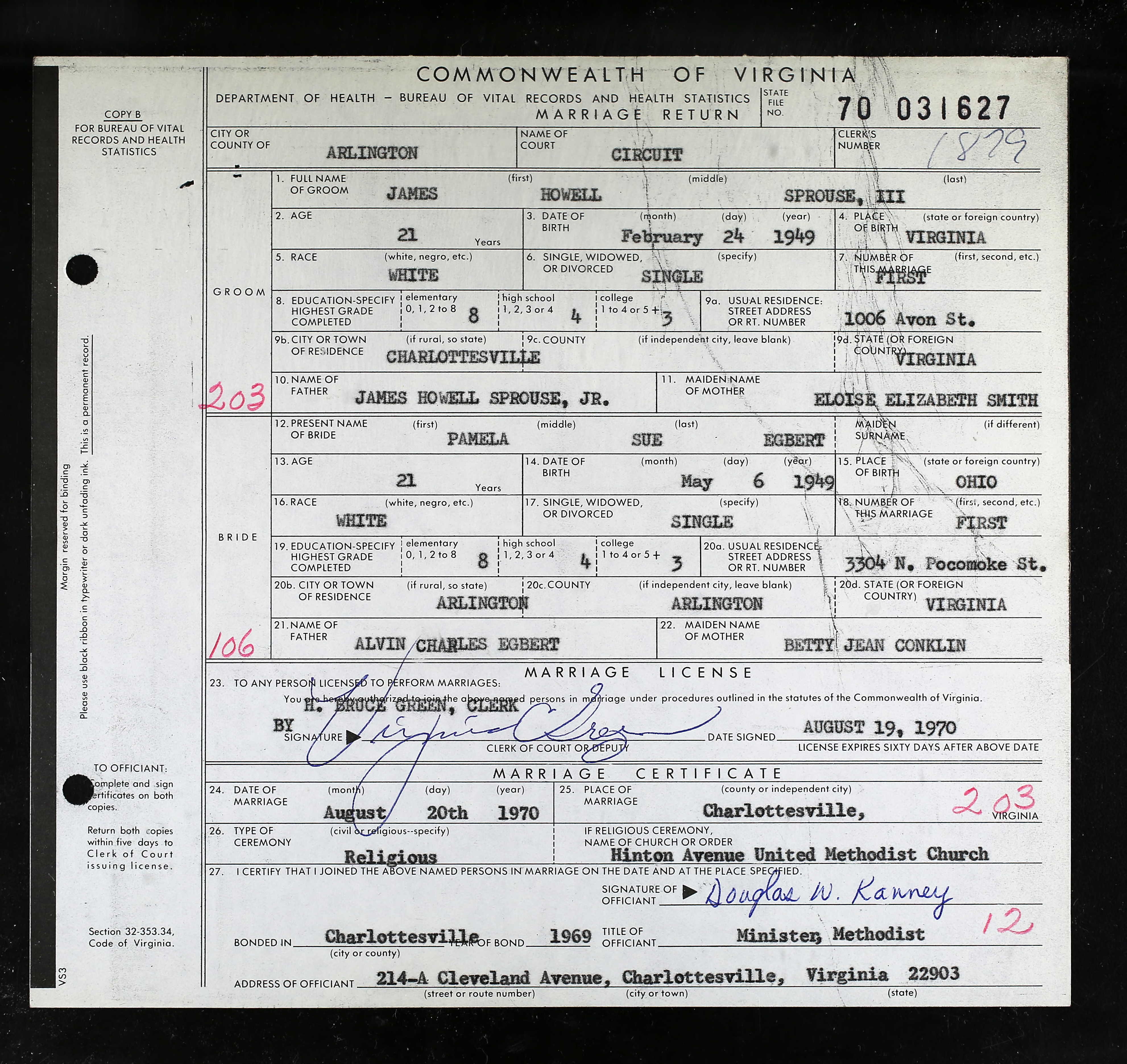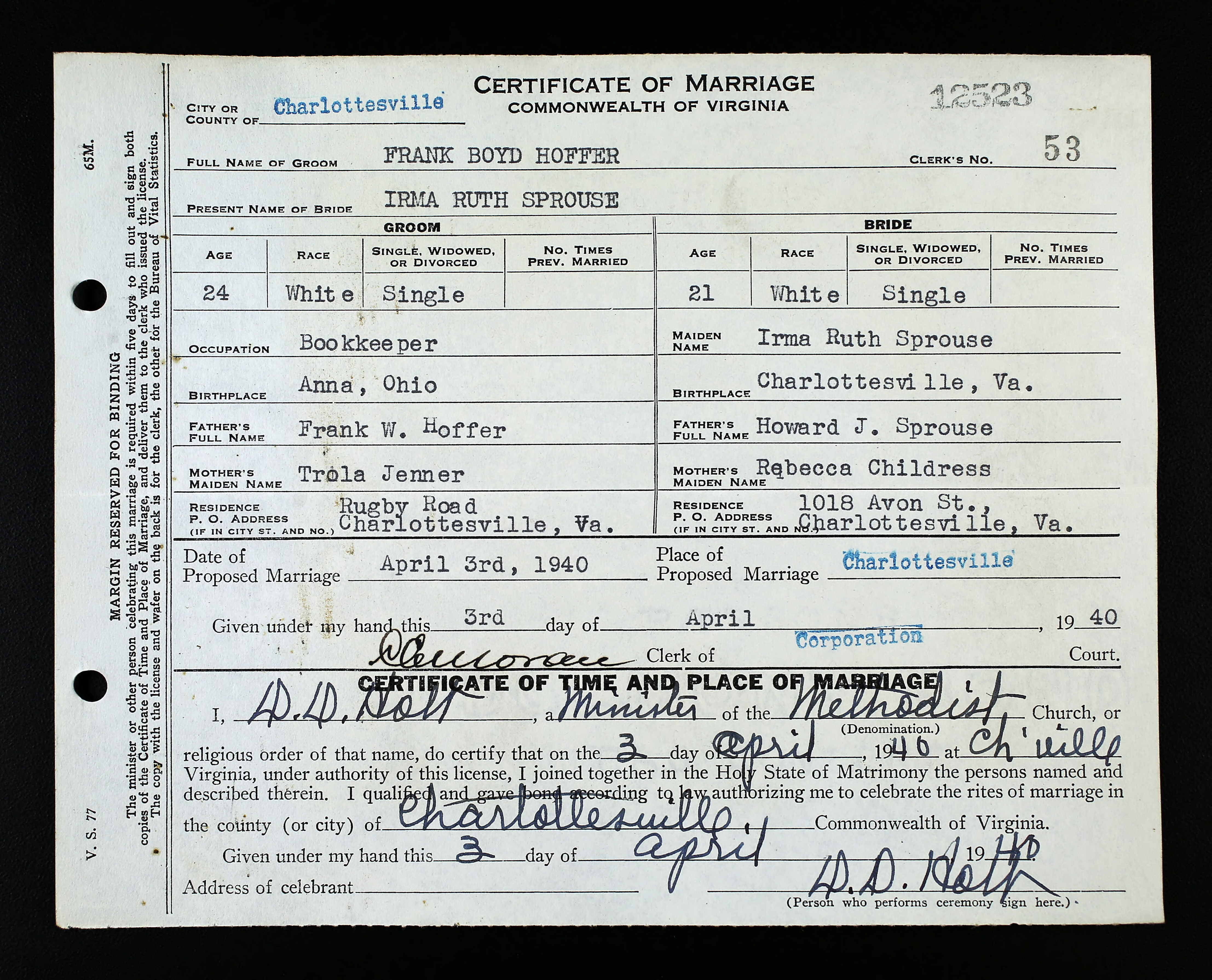 1087. Charlottesville, VA Marriage Records, Marriage Certificate.
