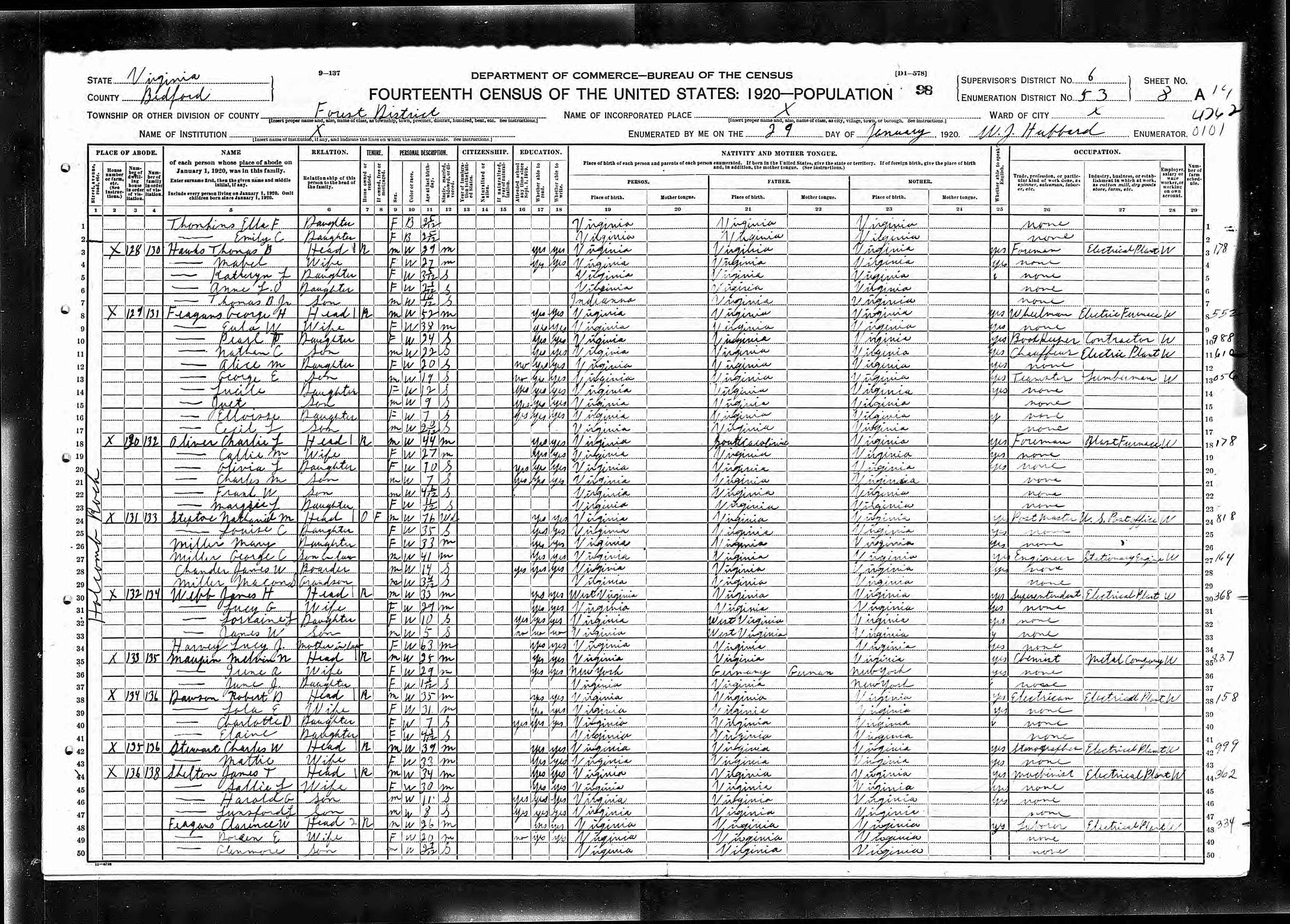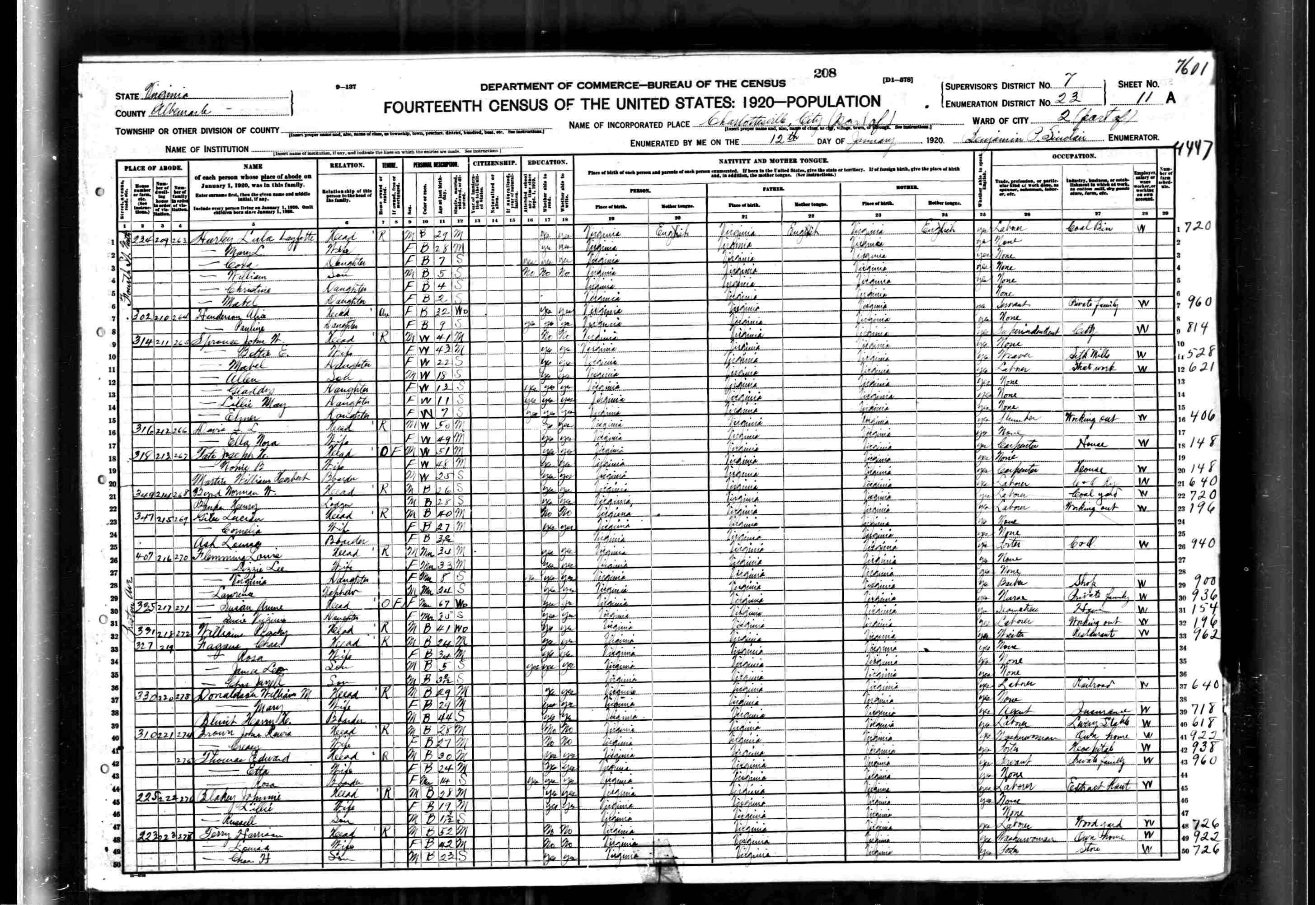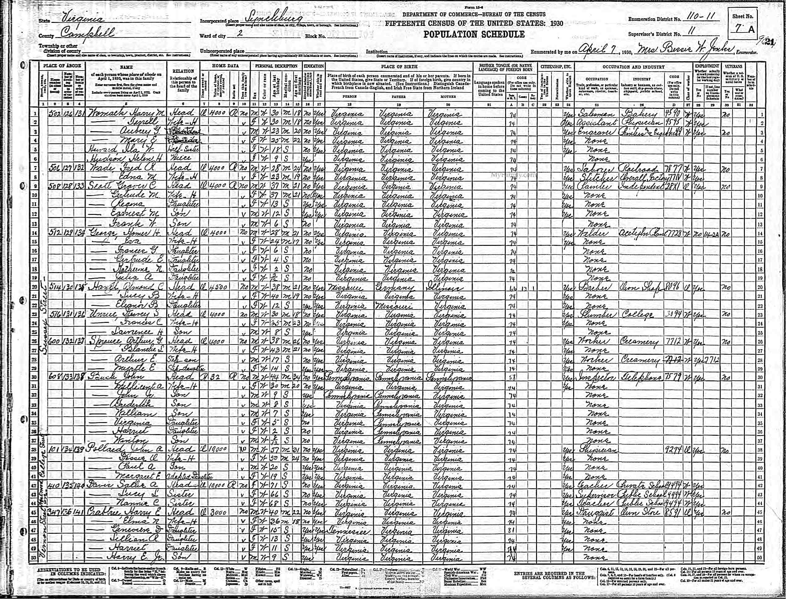 1063. 1930 Virginia Census, Lynchburg, Lynchburg, ED 20, Sht 14B, Image 28 Roll 2468, p. 14B, ED 20, Image 967.