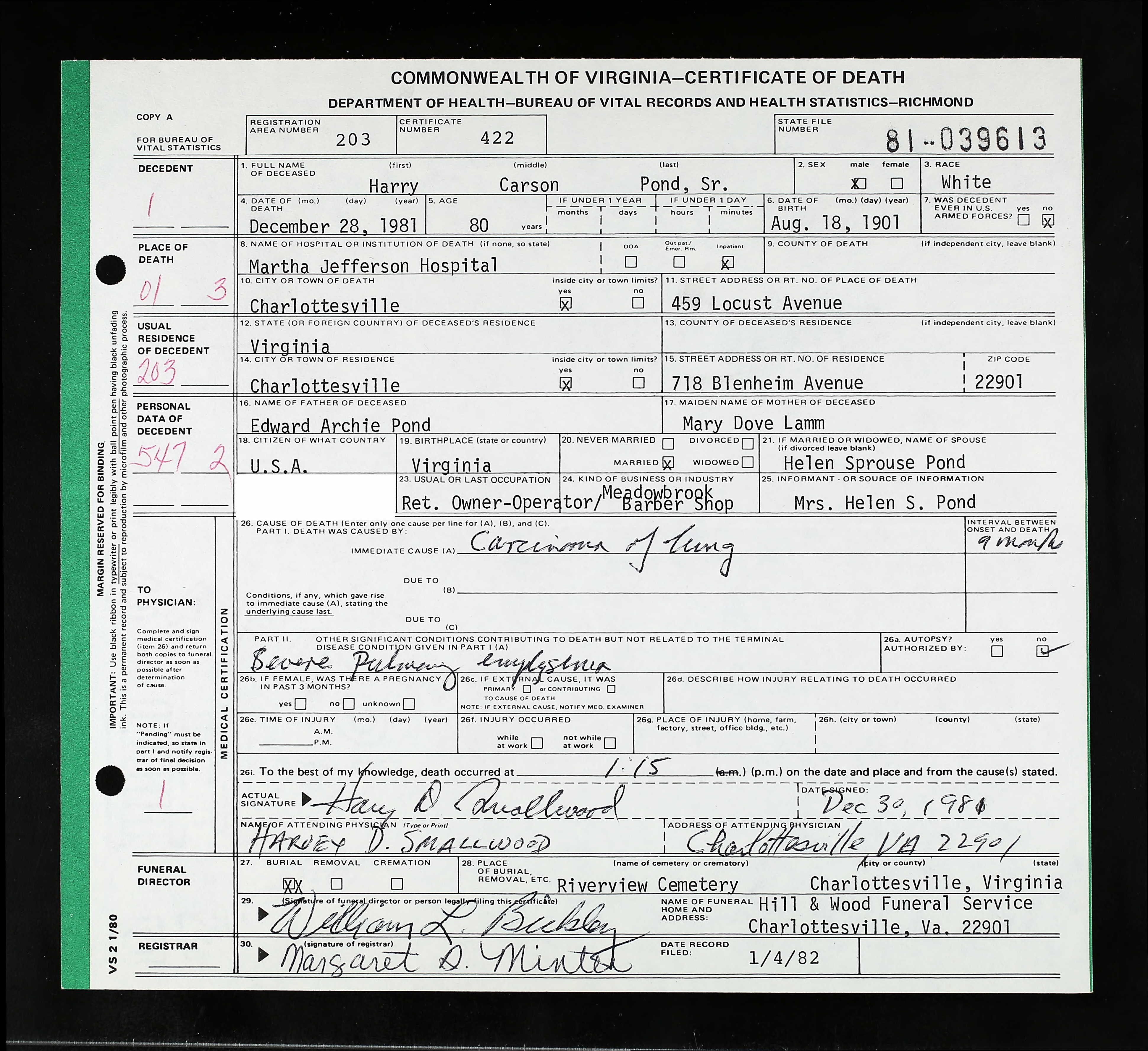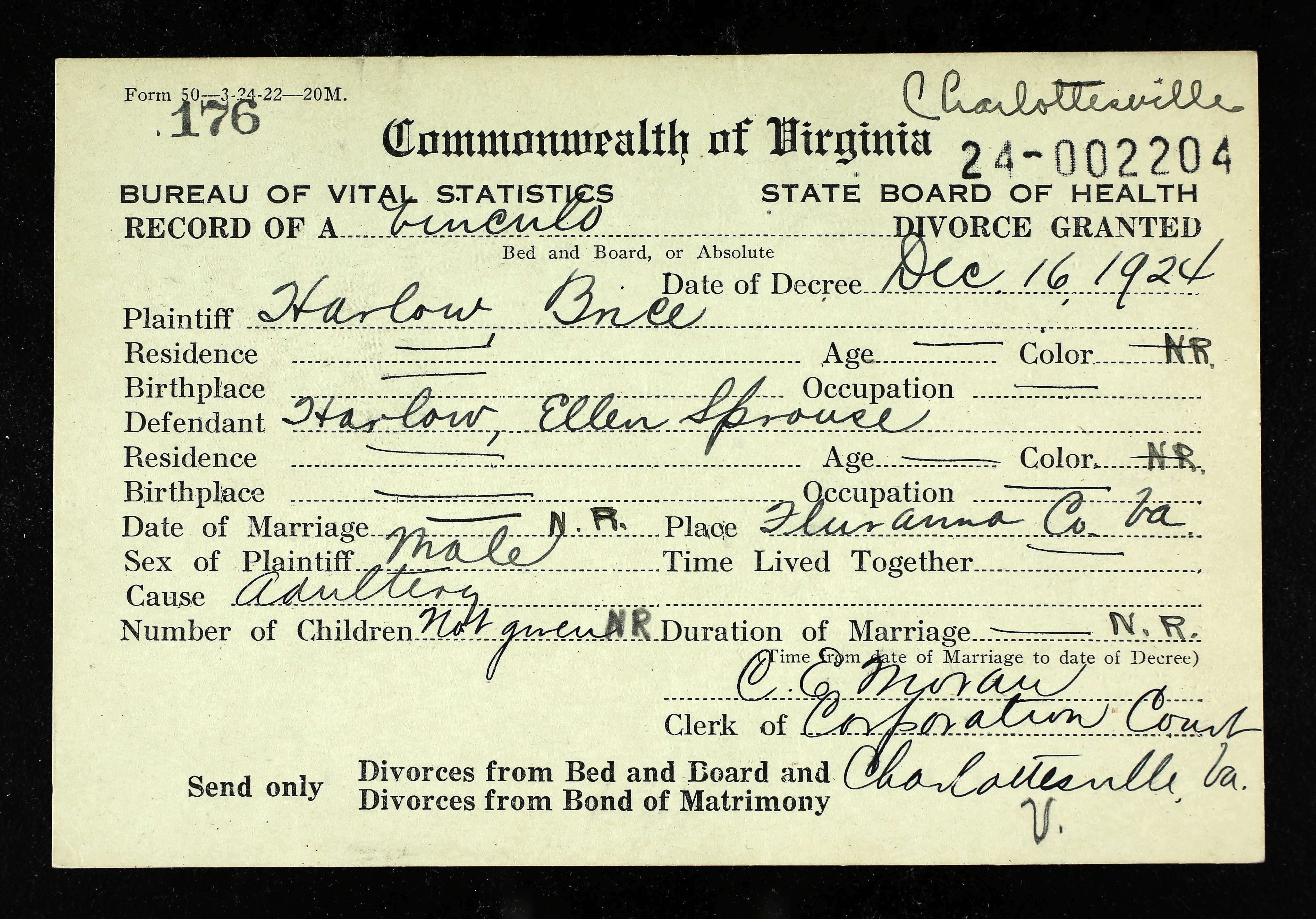 1072. Augusta County Clerk of Court, Harry Carson Pond & Patsy Ann Harlowe.