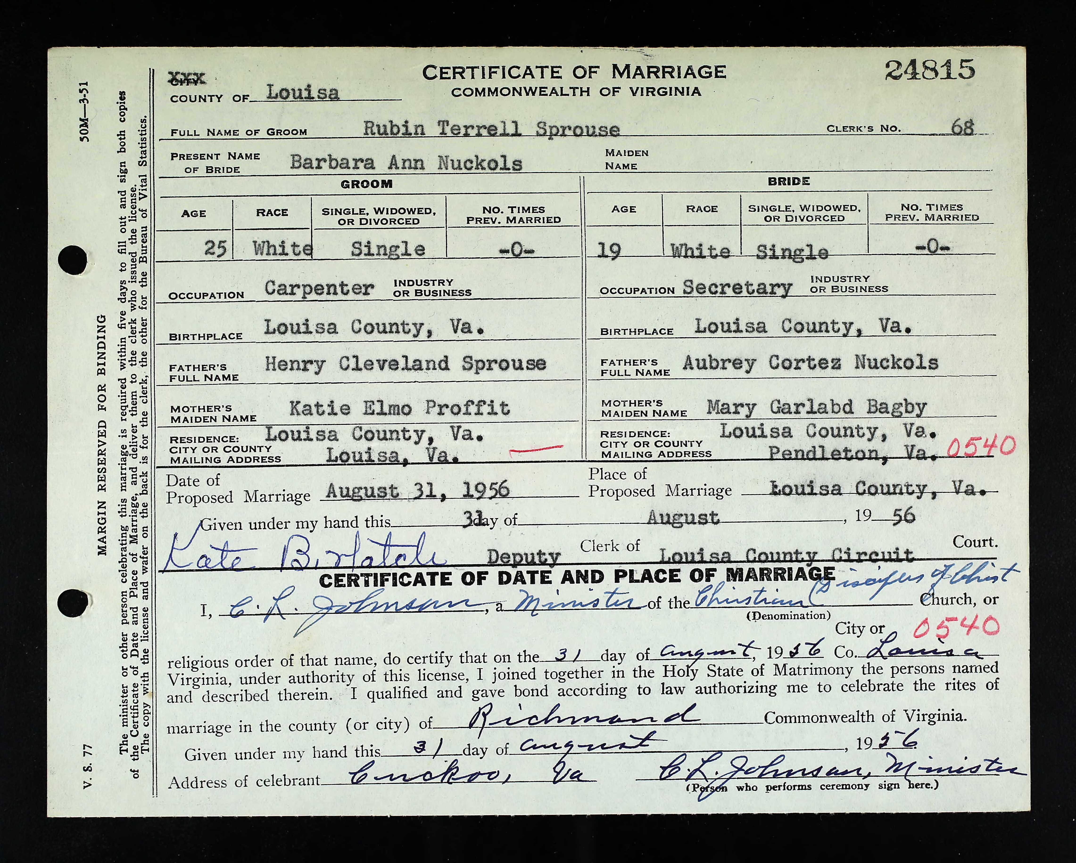 1067. Augusta County Clerk of Court, Virginia, Marriage Records, 1936-2014, 24698-24949.