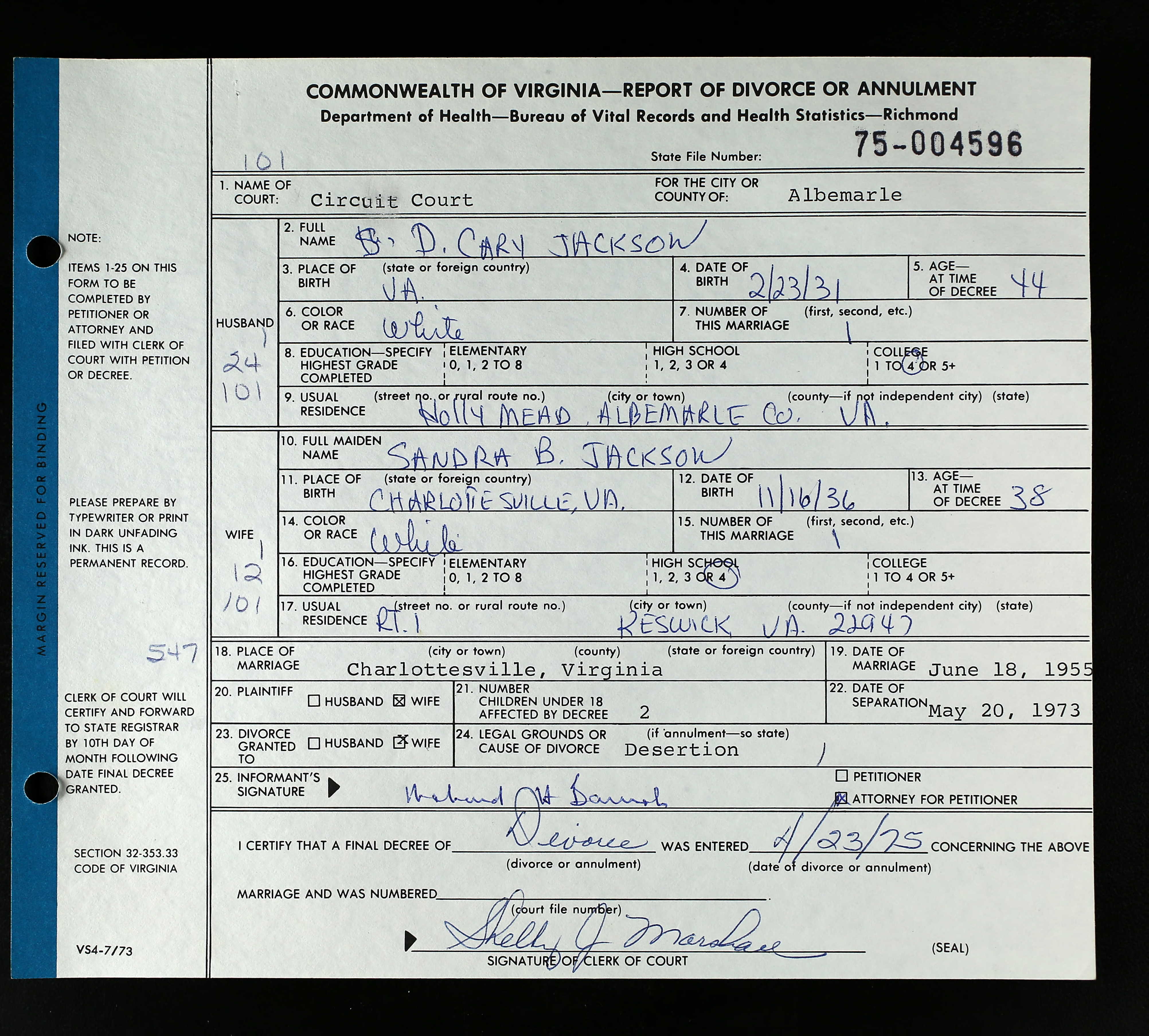 1076. Divorce or Annulment, D. Cary Jackson and Sandra B. Jackson.