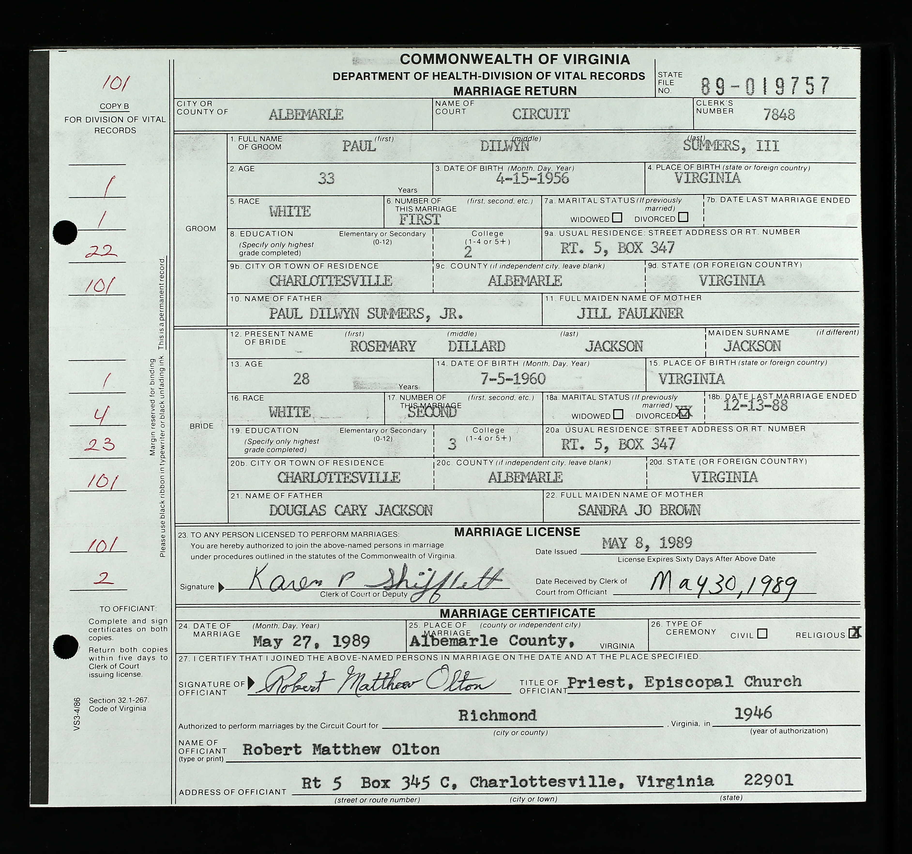 1093. Augusta County Clerk of Court, Paul Dilwyn Summers III and Rosemary Dillard Jackson.