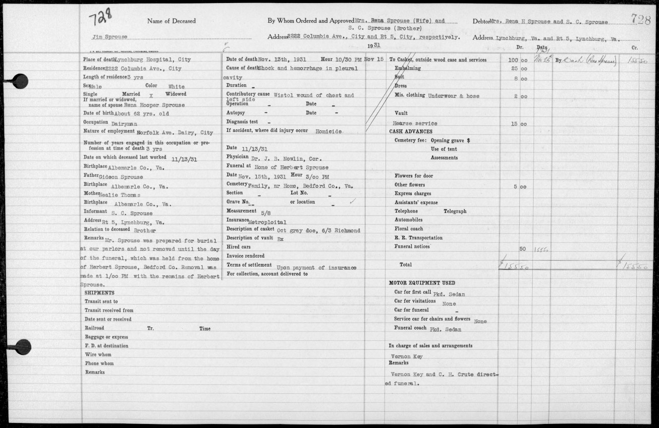 Mr. Sprouse married Rosa Belle Harlow, of this city, who died several years ago. Surviving is one son, J. Howell Sprouse, Sr. of this city, four grandchildren, Mrs. Harry C. pond, Mrs. Harry J. Brown and J. Howell Sprouse, Jr. all of this city, and Mrs. L. Benton Stevens, Jr., of Norfolk and five great grandchildren.